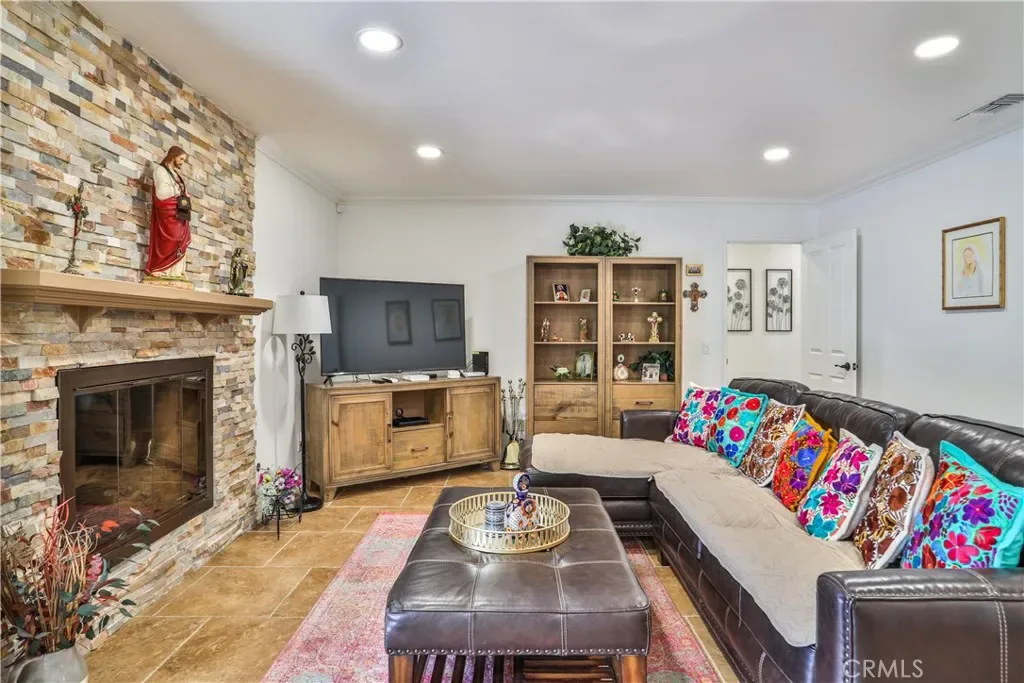 The thoughtfully designed floor plan features a bright living room and formal dining area highlighted by large bay windows that fill the home with natural light. The well appointed kitchen includes granite countertops, double ovens, a gas range, and a breakfast area, making it ideal for both everyday living and entertaining. A separate family room with fireplace opens directly to the backyard, creating a warm and inviting gathering space.