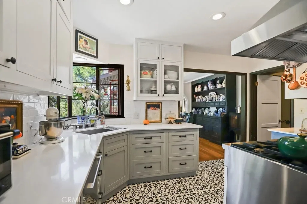 Adding exceptional value is a fully permitted detached second residence (ADU/guest house) completed in late 2020, approximately 864 sq ft, featuring two bedrooms, full kitchen, living area with fireplace, laundry room, and covered parking. Perfect for multi-generational living, guests, executive office space, or potential rental income.