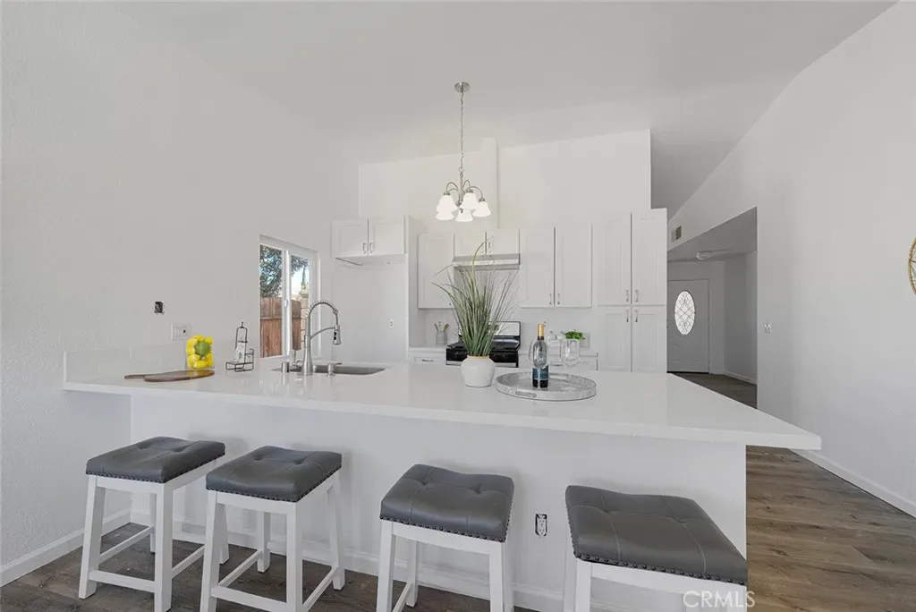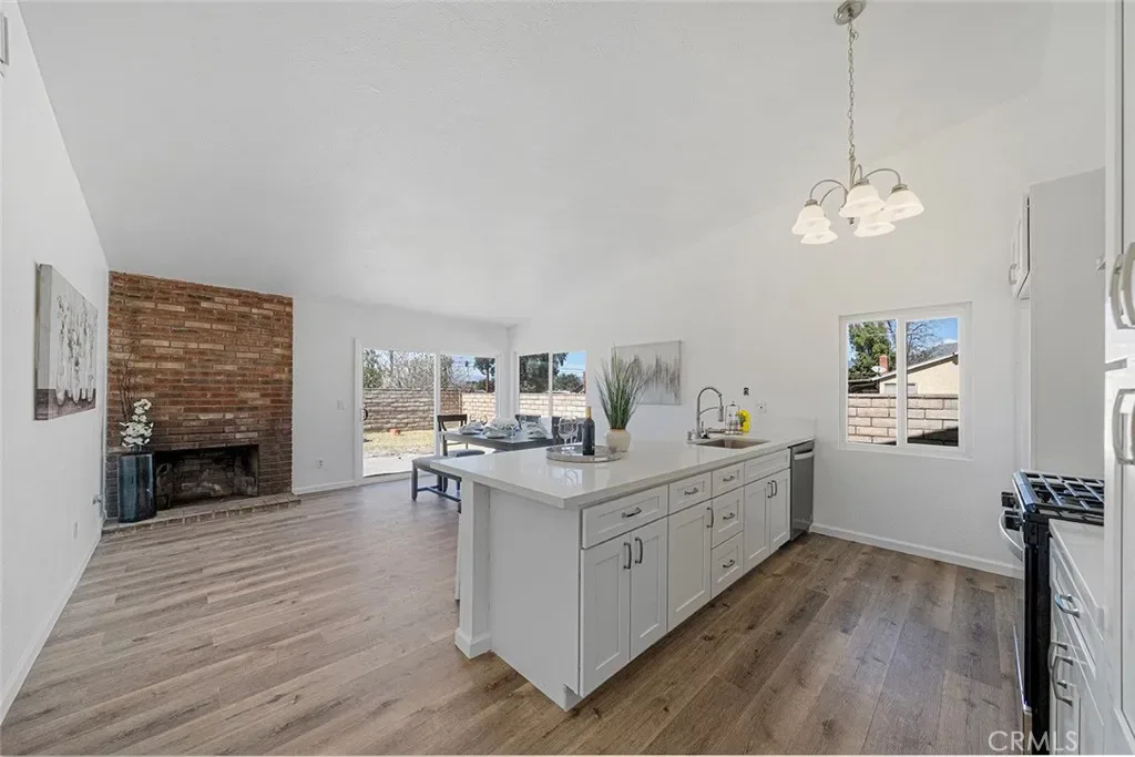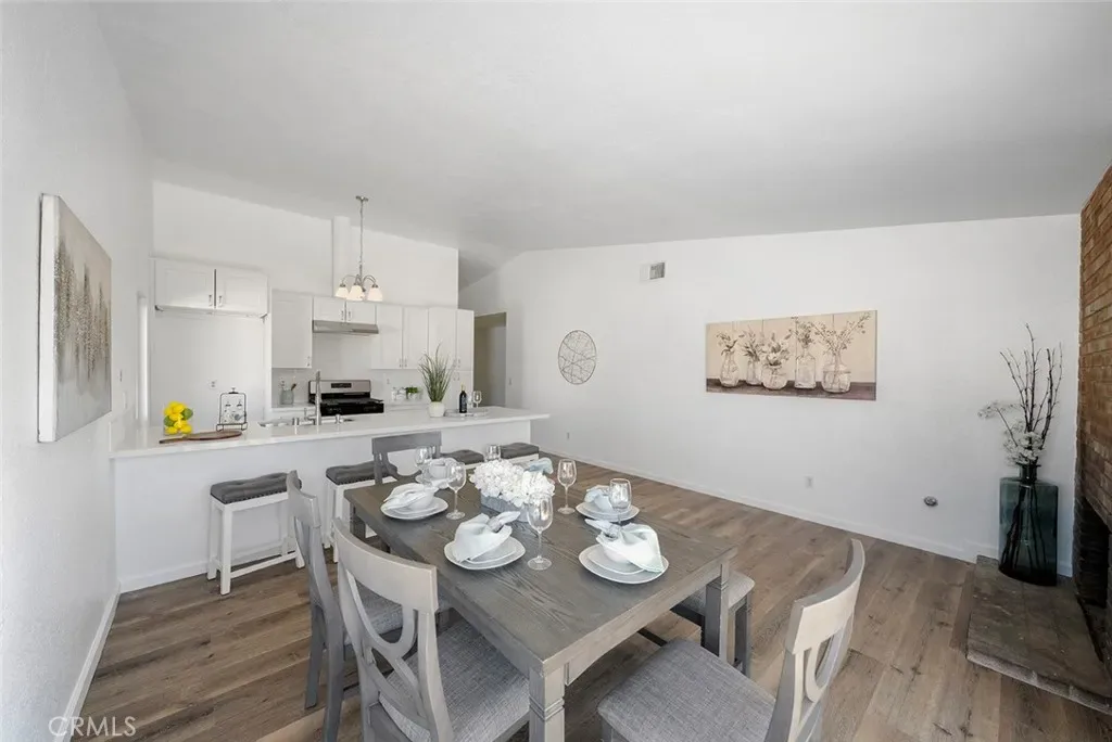 The home flows naturally into the kitchen/dining area, a versatile space that can easily serve as a second living room. A cozy fireplace tucked into the corner creates a welcoming focal point for gatherings or quiet evenings at home.