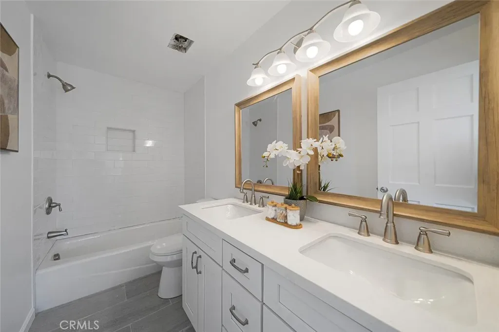 The primary bedroom offers a peaceful retreat w/ two separate closets & sliding doors that open to the backyard. The en-suite bathroom features dual sinks, sleek tile finishes, a cast iron tub, and built-in shower shelves, creating a spa-inspired space for daily routines.