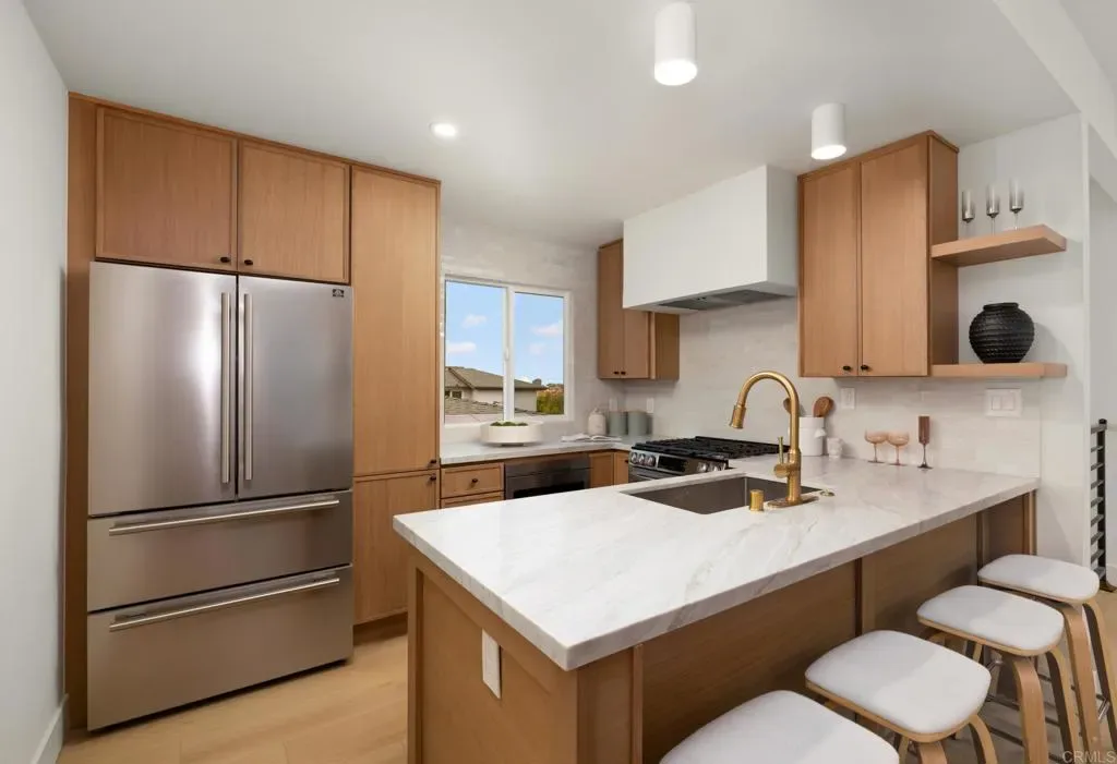 Experience elevated coastal living in this fully remodeled 3-bedroom, 2.5-bath home in Redondo Beach’s sought-after Golden Hills. Spanning 1,691 sq ft, this thoughtfully designed reverse floor plan places two bedrooms and a full bath on the entry level, along with direct access to the two-car garage and a private landscaped patio—ideal for relaxing or entertaining. Upstairs, the main living area is bright and open with soaring ceilings, abundant natural light, a fireplace, and a balcony with neighborhood views. The living, dining, and kitchen spaces flow seamlessly together, highlighted by white oak slim shaker cabinetry, new appliances, and modern finishes. A shiplap accent wall adds warmth and character to the dining area. The primary suite offers a peaceful retreat with a walk-in closet and a beautifully updated en-suite bath featuring a greige shiplap accent wall and a zellige-tiled shower with a built-in bench and niche. The secondary bath showcases a fresh, modern take on a classic design with navy accents and penny round tile flooring. Located just minutes from the beach, parks, schools, and shopping, this home blends elevated design with everyday functionality.