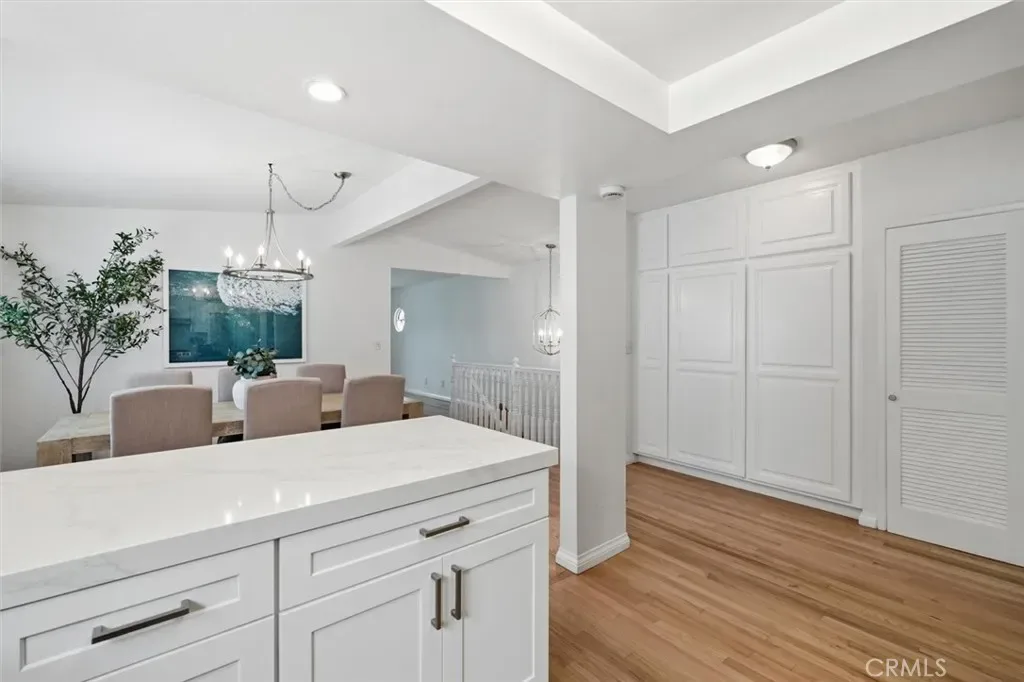 The remodeled kitchen connects directly to the dining area and features quartz countertops, stainless steel appliances, a breakfast bar, and abundant cabinetry designed for both daily living and casual gatherings.