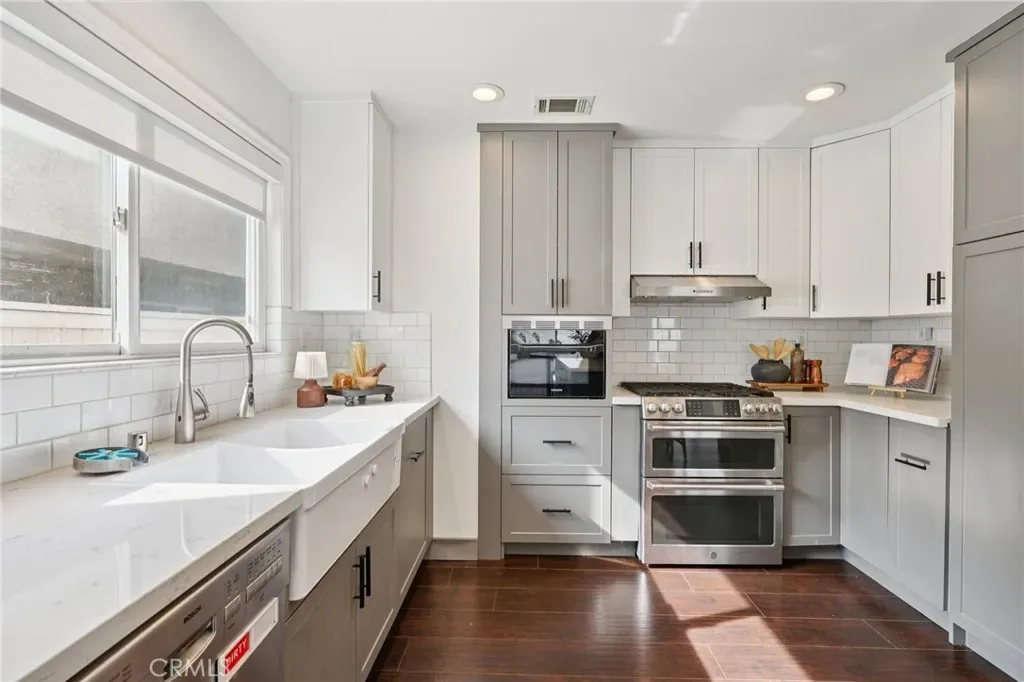 The kitchen delivers both style and substance, featuring sleek shaker cabinetry, quartz countertops, stainless steel appliances including a double oven, 6-burner gas cooktop, LG refrigerator, Bosch dishwasher, and a center island ready for everything from casual mornings to full-scale entertaining.