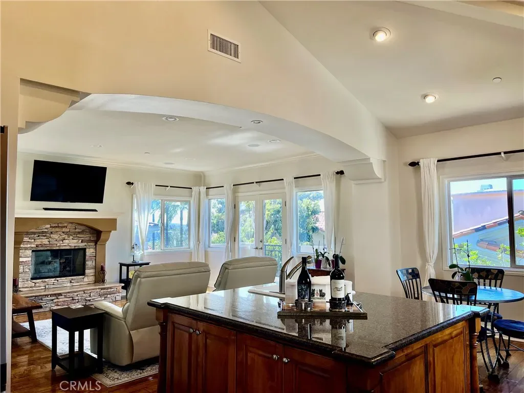 The first floor stairs lead to a gorgeous living room area, all hard wood floors, with a beautiful stone gas fireplace and large ocean facing windows for amazing natural light adorned with new drapes with balcony off the French doors facing the ocean. The open floor plan also has a wonderful chef’s kitchen with vaulted ceiling adjacent to the living area with a large island and granite countertops and backsplash. The kitchen has new Bosch appliances (range and dishwasher) and a newer Whirlpool French four door refrigerator. Off the kitchen and hall is a formal dining room, a half bathroom and then leads to a large master bedroom with built in office and armoire in addition to a large walk in closet with full built-ins. The master bathroom has a large walk in shower, jetted tub and dual sinks. All bedrooms have plantation shutters. The house has recently painted interior and exterior. From the second floor the patio door opens to spiral stairs that lead to a very large roof top deck that has 180 degree ocean views from Malibu to Palos Verdes and is perfect for enjoying a BBQ with friends and family or enjoying a glass of wine and watching the amazing sunset over the ocean. Bear in mind the large roof top deck is not included in the 2,480 sq. ft. This house is a short walk to the Redondo Beach pier and the beach. The house is gorgeous in many ways and is waiting for you!