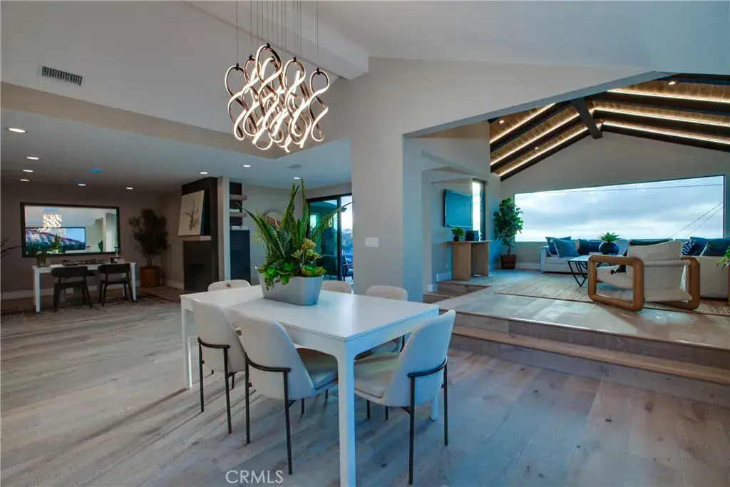 The rear living room is the architectural highlight, featuring vaulted ceilings with exposed wood beams and custom integrated LED lighting that accentuates the dramatic wood-plank detail overhead. A seamless flow leads into the dining area and designer kitchen, where quartz counters, premium stainless steel appliances, custom cabinetry, and an oversized island create a stylish and functional space for both entertaining and everyday living.