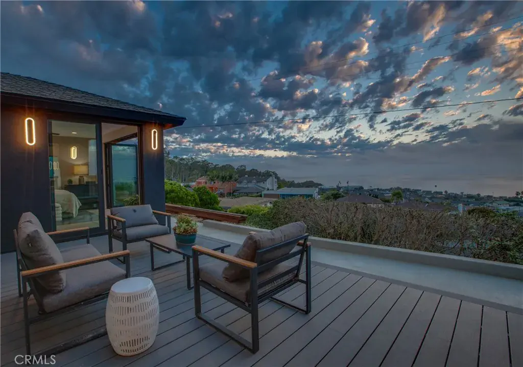 Outdoor living is equally impressive, with multiple view decks oriented toward the Pacific, blending indoor comfort with breezy coastal elegance. The contemporary exterior showcases stone and wood accents, complemented by drought-tolerant landscaping and a two-car garage with custom doors.