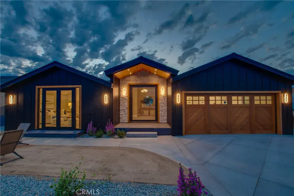 A Contemporary coastal ranch with modern farmhouse elements. The dark vertical siding paired with warm wood garage doors and trim provides a strong contrast and upscale curb appeal; Linear sconces add modernity and make the exterior glow at dusk, emphasizing architectural lines. A new horizontal cedar fence frames the lot, blending with the wood tones of the home. Minimalist landscaping (gravel, succulents, and low-water plants) suits a coastal climate and low-maintenance lifestyle.
