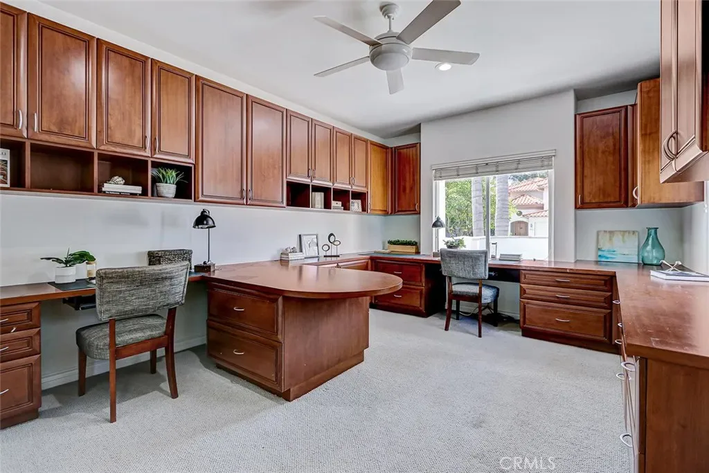 The newly remodeled kitchen is beautifully appointed with a Sub-Zero refrigerator, a generous center island with seating, and a bright breakfast area overlooking the private backyard—ideal for indoor-outdoor living. Upstairs, the huge primary suite serves as a true retreat, featuring its own fireplace, a private balcony overlooking the yard, an oversized walk-in closet, a luxurious two-person shower, and a spa-like soaking tub. Three additional upstairs bedrooms include one with an en-suite bath, while the other two share a Jack-and-Jill bathroom and each enjoy their own private balconies. A fifth bedroom on the main level is currently configured as a custom office with built-in cabinetry and desks.