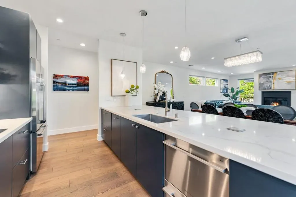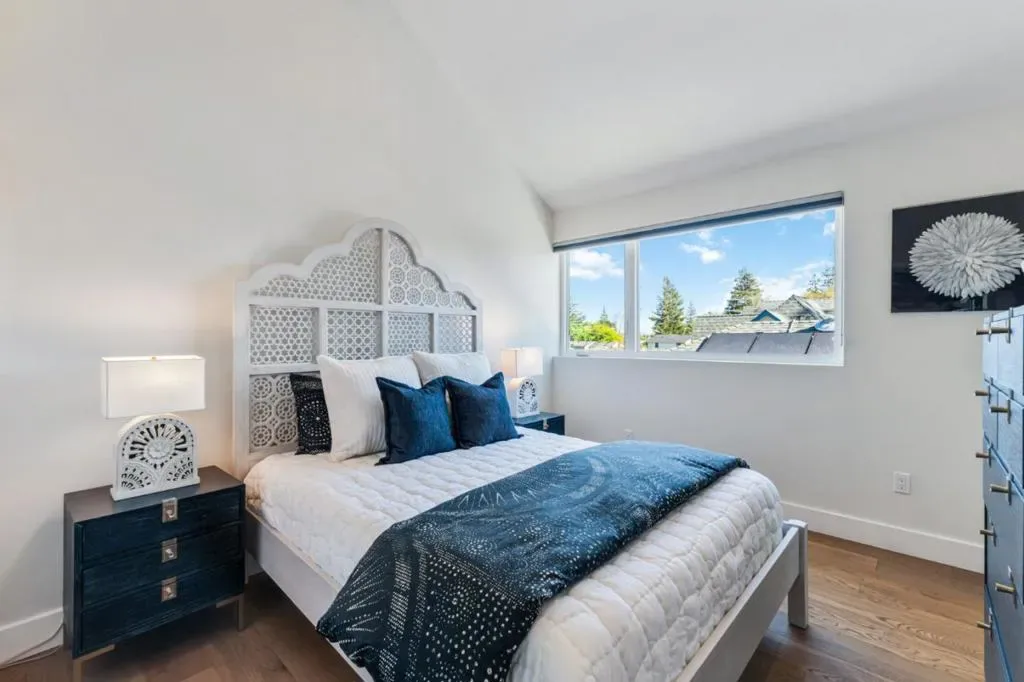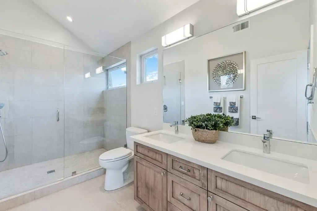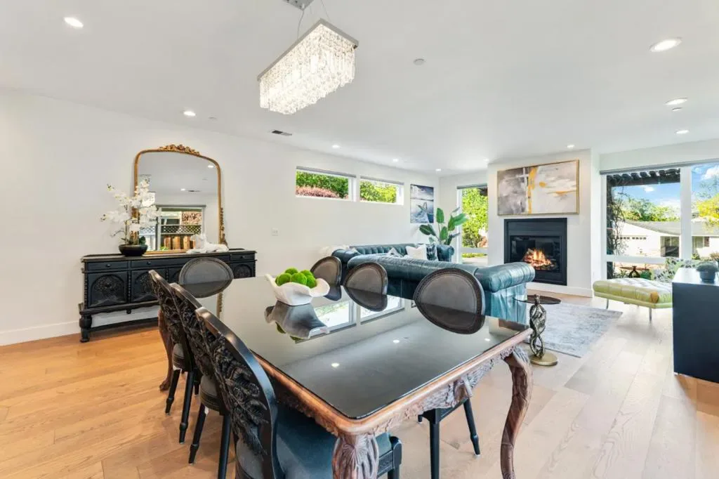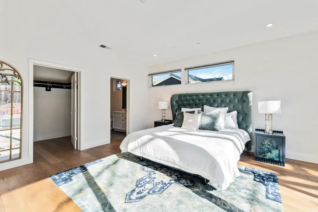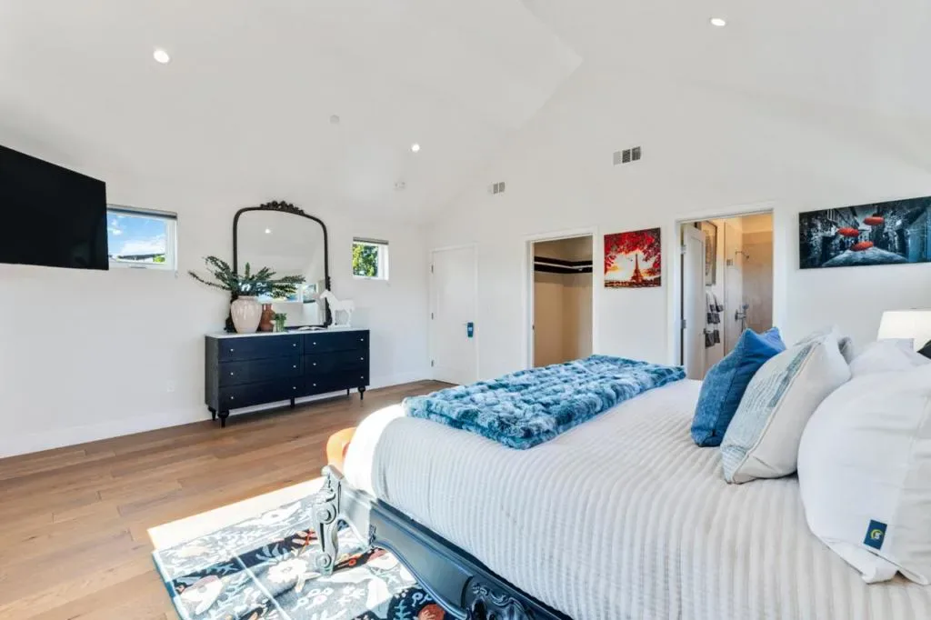 A stunning modern farmhouse blending contemporary architecture w/ warm, refined finishes. Designed with soaring ceilings, expansive windows, and an open layout, the home is filled with natural light and a seamless indoor-outdoor connection. The heart of the home is a chefs kitchen w/ custom cabinetry, elegant Calacatta and white quartz countertops, and premium stainless steel appliances. The space flows effortlessly into the dining and living areas, creating an ideal setting for everyday living and entertaining. The thoughtfully designed floor plan offers four bedrooms including two luxurious primary suites. One suite is conveniently located on the main level w/ direct backyard access, while the upstairs primary retreat features vaulted ceilings and a serene, private atmosphere. An additional upstairs family room provides flexible space for a media lounge, office, or play area. High-quality finishes throughout include Monarch Plank flooring, Porcelanosa tile, Hansgrohe and Grohe fixtures, Toto toilets, and Kohler sinks. Modern comforts include Milgard windows, dual-zone HVAC w/ Nest thermostats, fire sprinklers, and upgraded utilities. The landscaped grounds feature lawn, mature plantings, and a paver walkway, creating a welcoming outdoor setting for relaxation and entertaining.