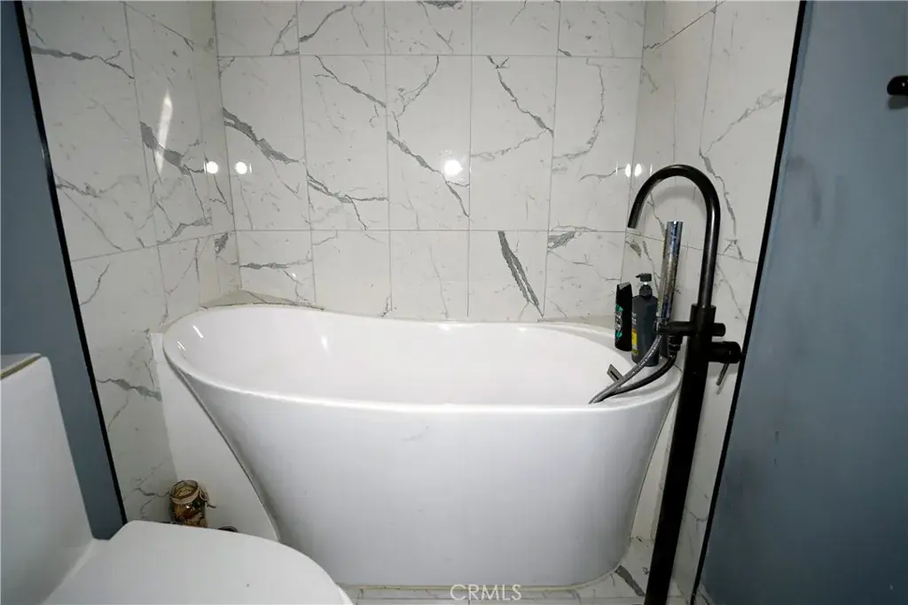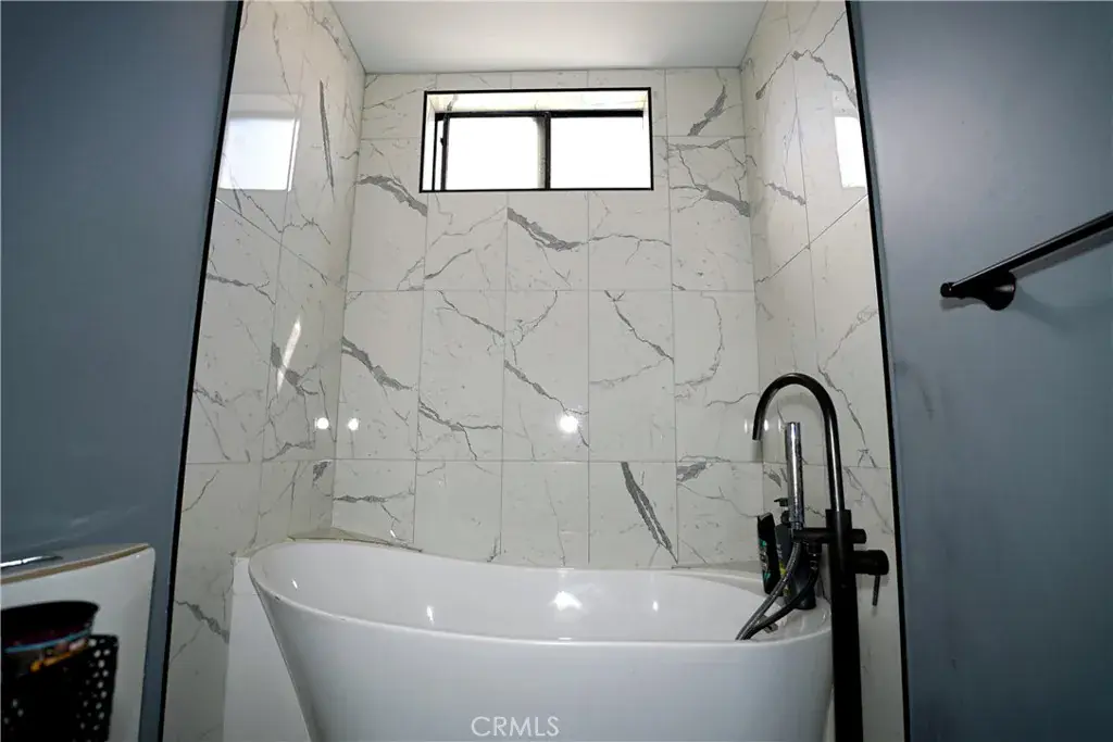 One of the upstairs bathrooms is an en-suite, located inside the primary bedroom and features a spa-inspired design with a pebble-stone walk-in shower, glass enclosure, and natural stone flooring. The second upstairs bathroom offers a clean, modern aesthetic with a full tub/shower combination accented by large-format marble-style tile and coordinating flooring facing the 2nd bedroom.