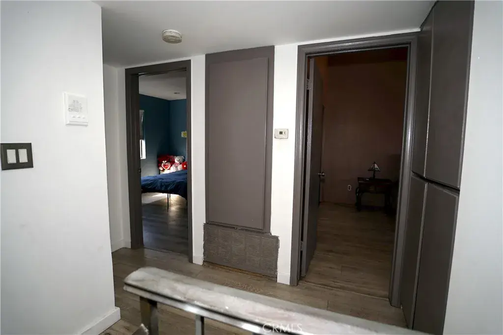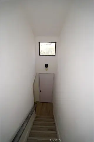 The living area features contemporary flooring, recessed lighting, a custom accent wall that adds character and style. and a striking floor-to-ceiling stone fireplace, creating a perfect focal point for relaxing or entertaining. Sliding doors open to a private patio, ideal for morning coffee or evening wine.. A staircase from the main living level leads to the second floor, where the bedrooms are located, providing excellent separation of living and private spaces.