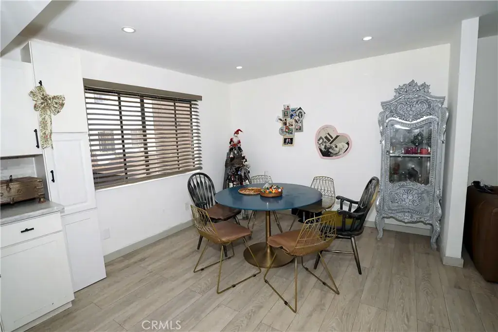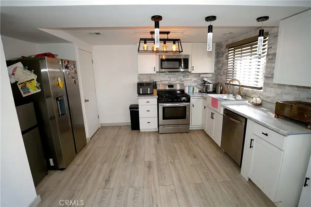 The unit features a private entry accessed via a short exterior staircase leading to an open and airy floor plan filled with natural light. The living, dining, and kitchen areas flow seamlessly, creating an ideal space for everyday living and entertaining. The updated kitchen showcases sleek white cabinetry, stainless steel appliances, pendant lighting, elegant porcelain countertops, and a complementary tile backsplash. Durable wood-style flooring runs throughout the main living areas, adding warmth and cohesion.