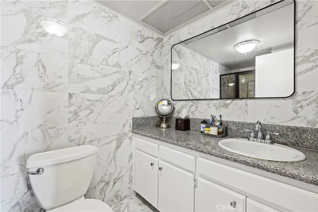 Generously sized bedrooms with vaulted ceilings and walk-in closet in the primary bedroom provide comfort and privacy. Bathrooms have been beautifully upgraded with granite countertops and tiles, designed for functionality and style. Large 2-car attached garage with additional storage area.