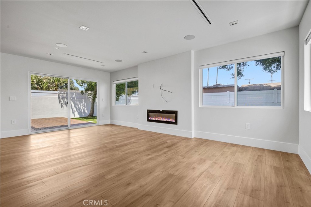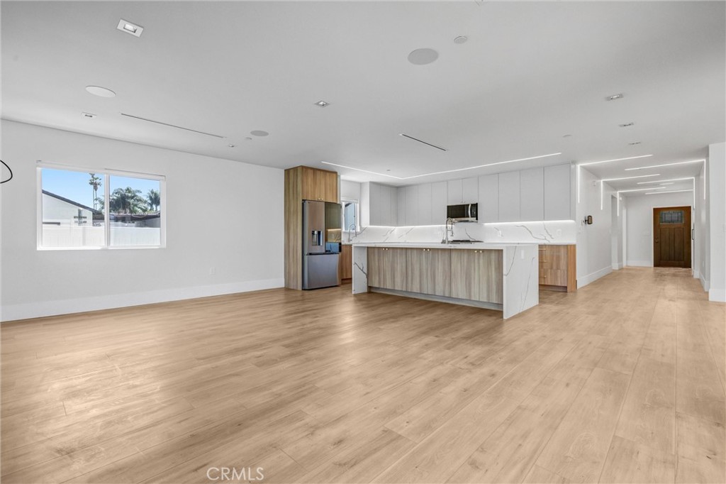 The primary residence is designed for modern living, showcasing a bright open-concept layout filled with natural light. The chef’s kitchen centers around an oversized island with custom cabinetry and premium stainless steel appliances. The spacious living room features a statement fireplace and oversized windows, with double doors opening to a private backyard deck surrounded by mature landscaping — creating seamless indoor-outdoor flow ideal for both everyday living and entertaining.
