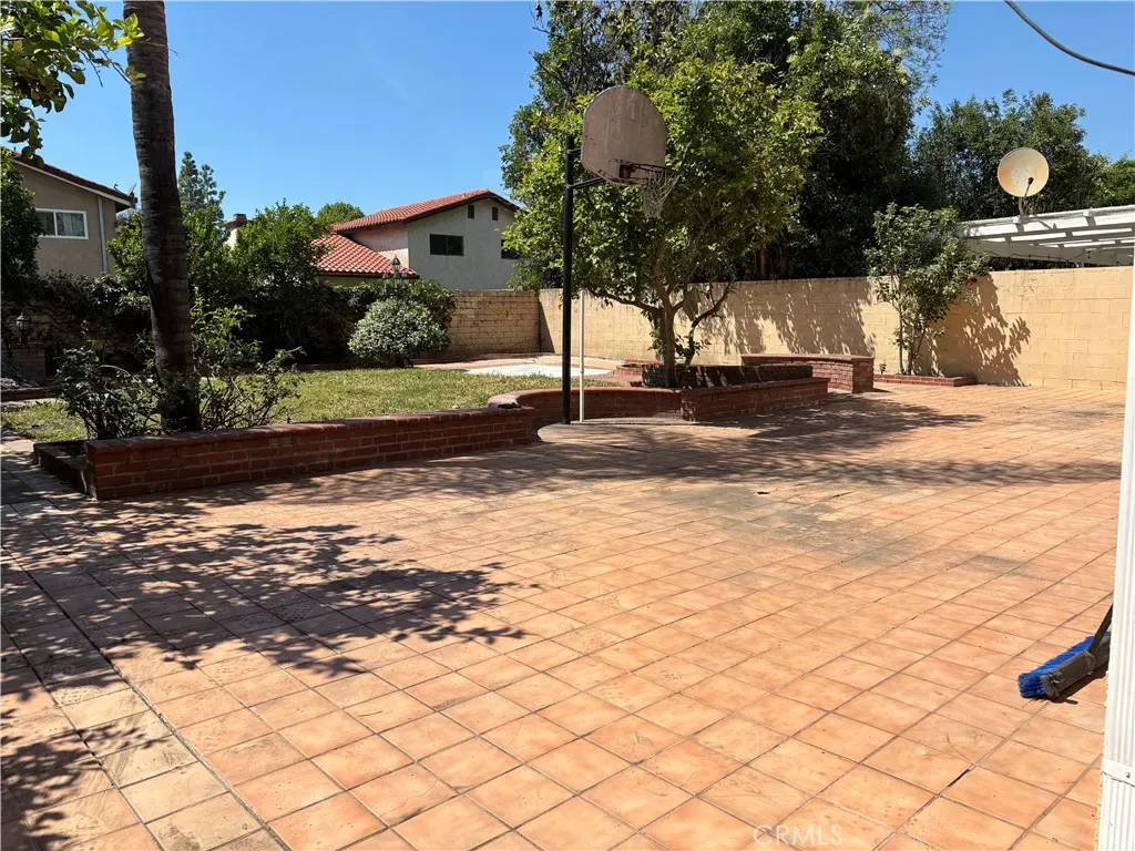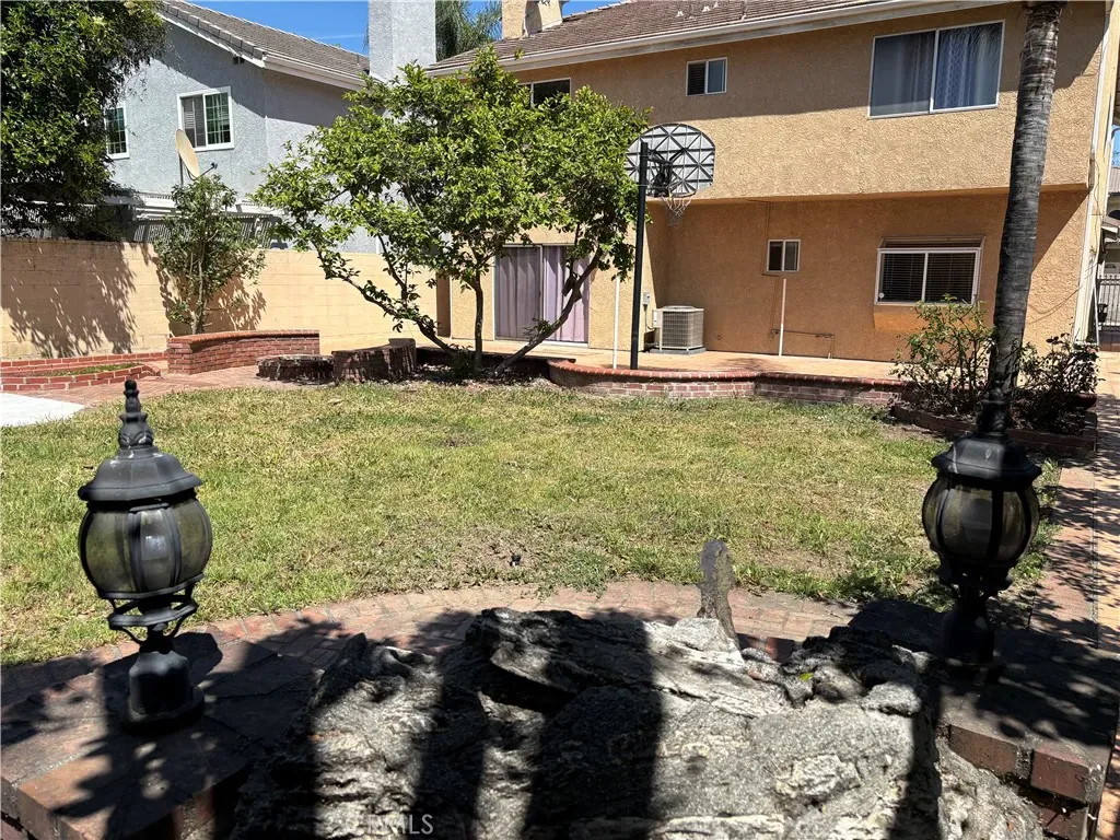 The backyard has a fountain, fire pit, basketball hoop, and lemon trees. Plenty of room to add a table and chairs for outdoor dining.