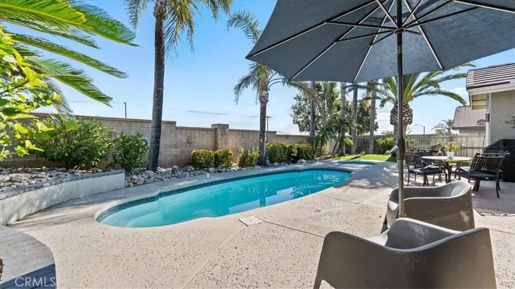 The transition from indoor to outdoor living is effortless. Step into your perfectly sized backyard sanctuary, featuring a sparkling pool and heated spa. Surrounded by lush landscaping, vibrant flowers, and mature trees, this is a peaceful “staycation” spot for morning coffee or weekend BBQs.