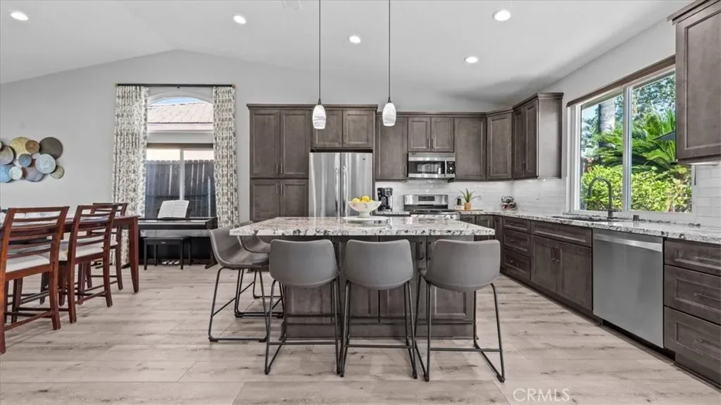Immediately through the front door, you will find a breathtaking open-concept great room where walls are minimal and the possibilities are endless. The home has been thoughtfully upgraded throughout. Designed for both daily life and grand entertaining, the seamless flow leads you to a chef-inspired kitchen featuring elegant granite countertops, extra tall dark wood cabinetry, and sleek stainless steel appliances. The upgraded oversized wide windows act as living frames for the landscape.