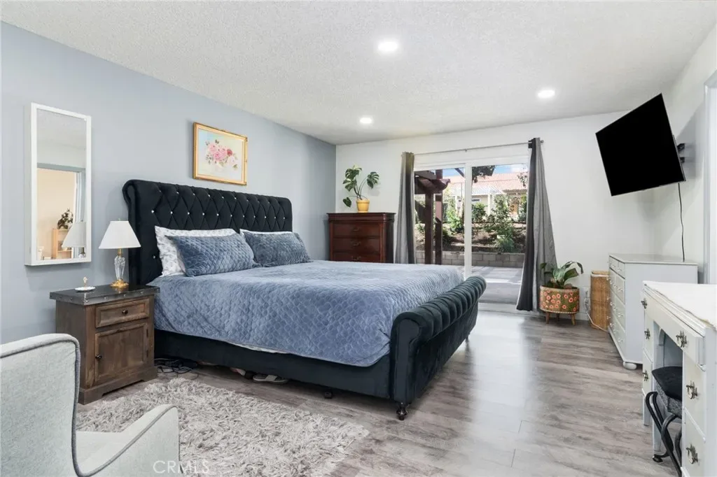 The primary suite serves as a private retreat, complete with a walk-in closet and a large bathroom featuring dual vanity sinks, a soaking tub, and a separate shower. Sliding glass doors lead directly to the backyard patio, creating a seamless indoor-outdoor living experience.