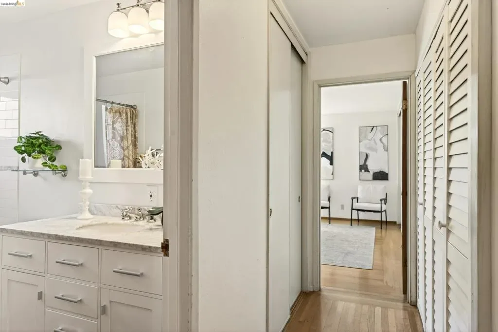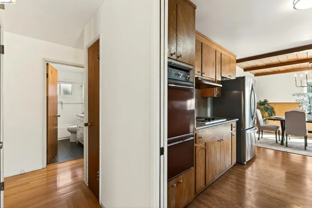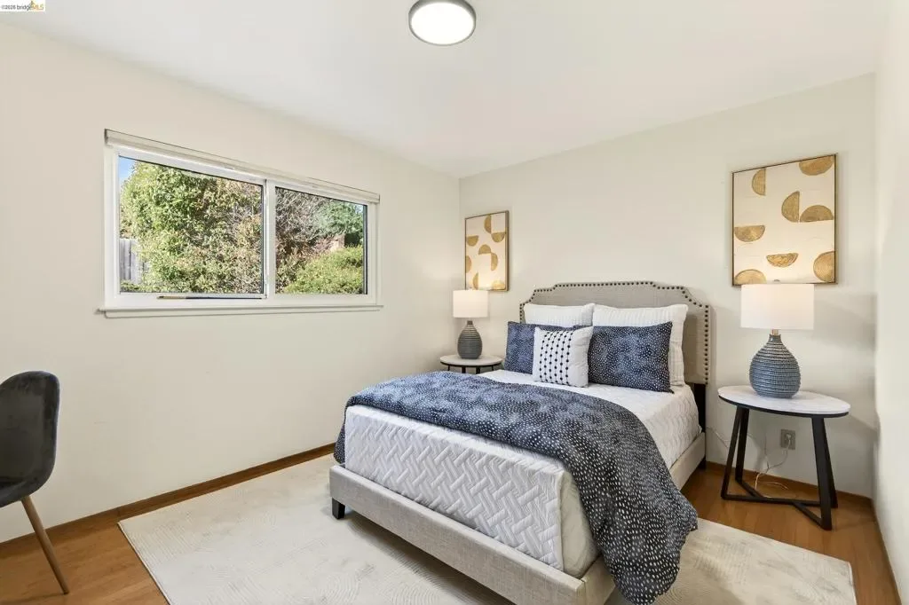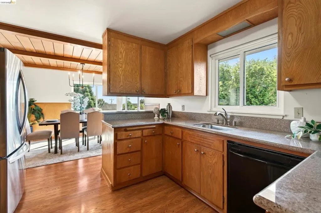 Built in 1959, this classic mid-century home offers timeless design and comfortable living in a desirable East Richmond Heights neighborhood. The home features almost 1,400 sq ft of living space, 3 Bedrooms, 2 beautifully updated bathrooms, and over 500 sq ft of 2-car garage space. The bathrooms have been thoughtfully renovated with stylish Pottery Barn-inspired finishes, creating a fresh and inviting feel while maintaining the home’s character. Large picture windows bring in natural light and allow for enjoying the views of Mount Tamalpais, the San Pablo Reservoir, and the Bay. The kitchen offers a great footprint and presents an excellent opportunity for a new owner to add their own design touches and create a kitchen of their dreams. Conveniently located near parks, schools, shopping, and commuter routes. This home blends classic architecture, modern updates, and future potential—serene backyard with mature landscape.