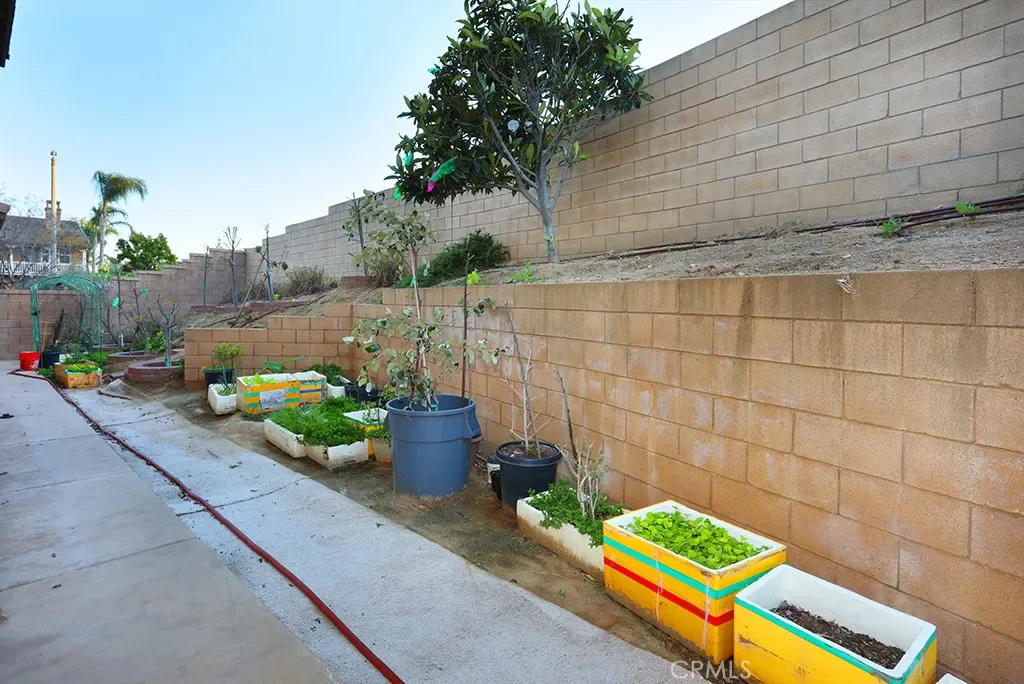 The outdoor space is ideal for relaxation and entertaining, featuring stamped concrete, multi-level planter beds with lighting, mature fruit trees, and a covered patio with built-in lighting, creating a peaceful and private retreat.