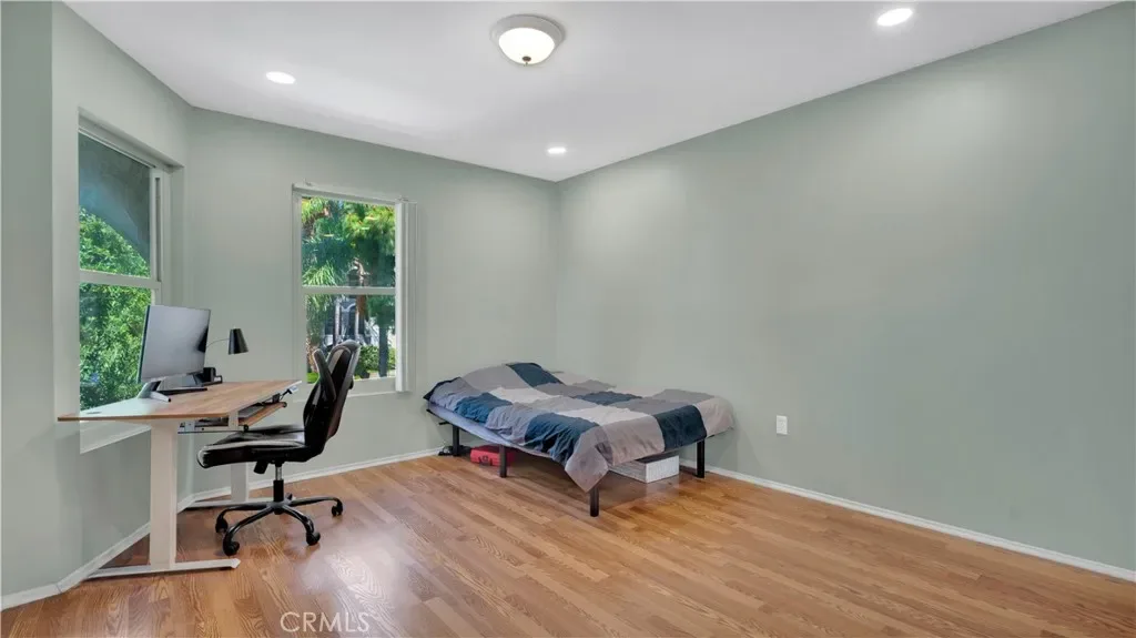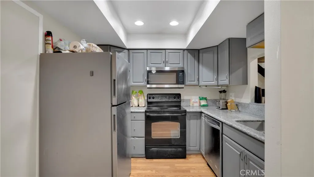 The open living and dining area features laminate flooring, recessed lighting, high ceilings, and abundant natural light, seamlessly connecting to the kitchen equipped with granite countertops, stainless steel appliances, ample cabinetry, and a convenient breakfast bar.