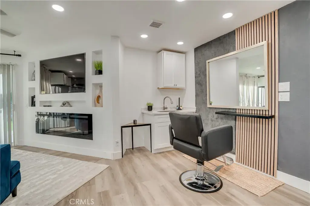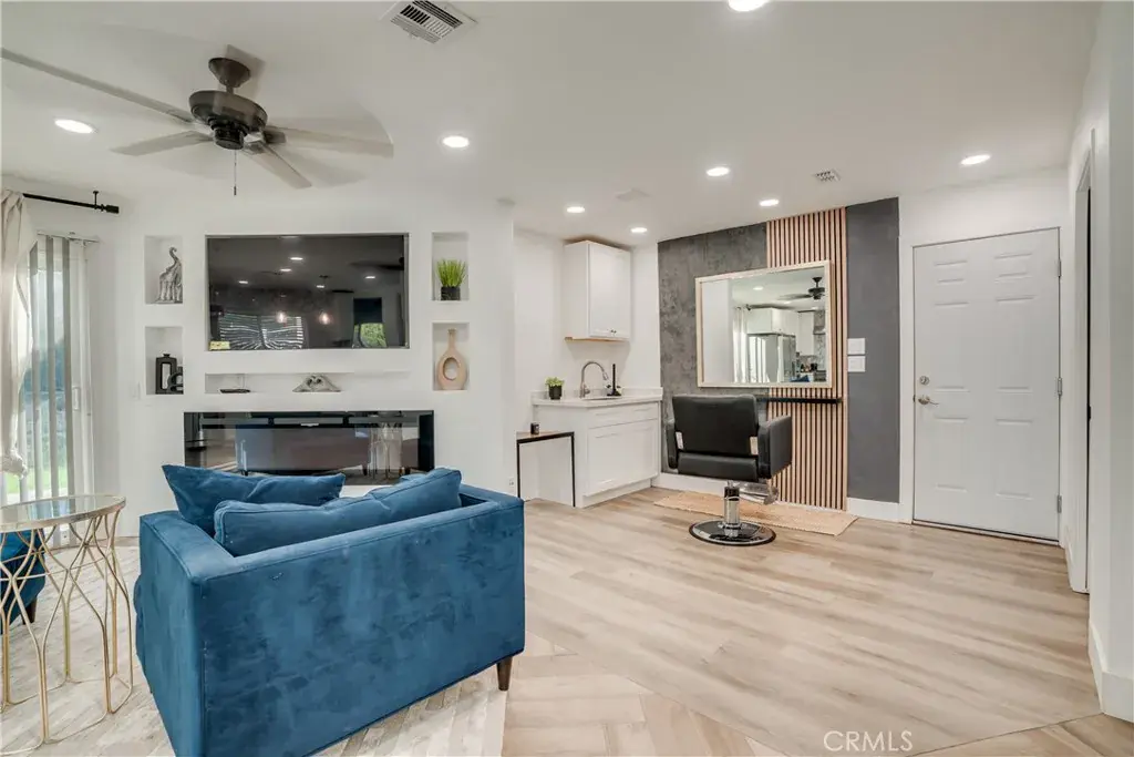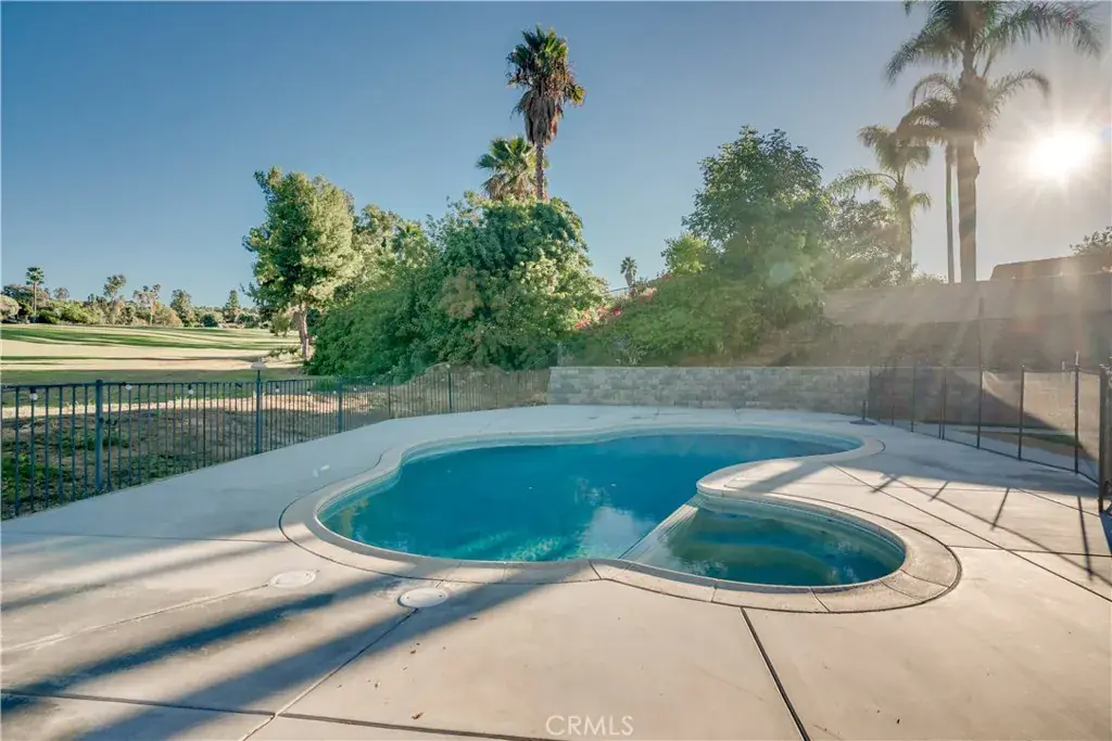 Thoughtfully customized from its original four bedroom design, the home now features a spacious three bedroom layout with a flexible guest suite, easily convertible back to a full four bedroom floor plan. The vaulted ceilings with exposed wood beams, wide plank herringbone vinyl flooring, and open flow between living, dining, and kitchen areas create a sense of modern elegance and warmth. The gourmet kitchen impresses with quartz countertops, a full height marble backsplash, stainless steel professional grade appliances, and a large island ideal for entertaining. The adjoining family room features built ins, an electric fireplace, and sliding doors leading to the backyard oasis. The luxurious primary suite includes a walk in closet and a spa inspired bath with dual vanities, soaking tub, and frameless glass shower. Each additional room offers comfort and versatility, perfect for guests, work, or multigenerational living. Enjoy the private pool and spa overlooking the golf course, surrounded by low maintenance landscaping and multiple outdoor areas designed for relaxation and entertaining. Every detail in this home blends sophistication with functionality, offering the perfect balance of indoor outdoor California living for all lifestyles.