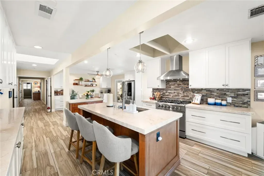 Inside, a stunning great room showcases vaulted wood-beam ceilings, a statement fireplace, and expansive windows that fill the home with natural light. The remodeled kitchen is the centerpiece, featuring custom cabinetry, quartz-style countertops, stainless steel appliances, and a rare double-island layout ideal for everyday living and entertaining.