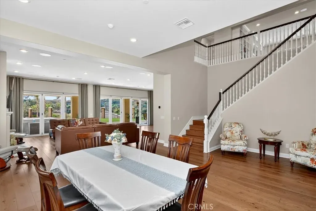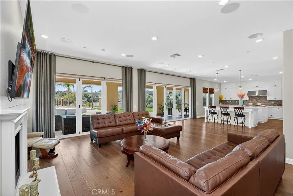 The family room opens seamlessly to the backyard through dual expansive sliding doors, creating a true indoor-outdoor living experience with panoramic canyon and mountain views.