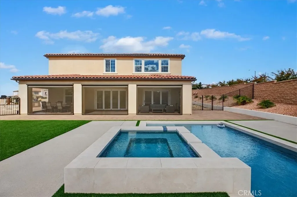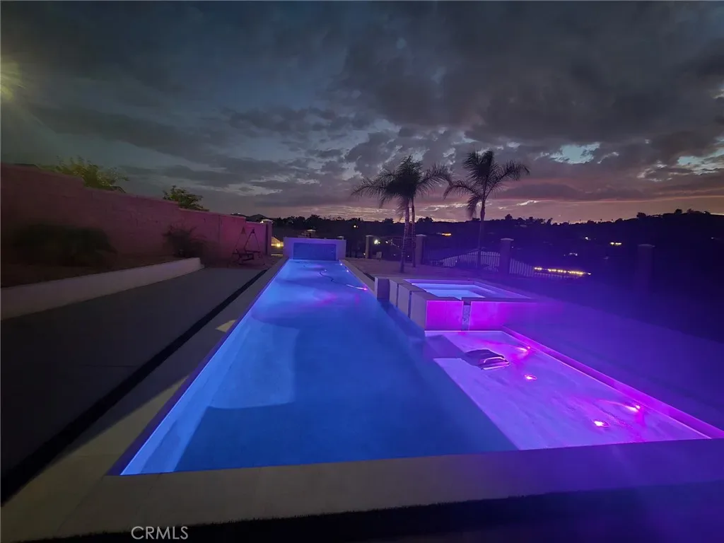 The resort-style backyard is the crown jewel of this estate—featuring a 60-ft custom lap pool, spa, multiple waterfalls and water features, a built-in BBQ island, firepit, pavers throughout, and professionally landscaped grounds with fruit trees and an orchard area. Block walls and wrought iron fencing surround the property with 3 pedestrian gates and a custom driveway gate for privacy and security.