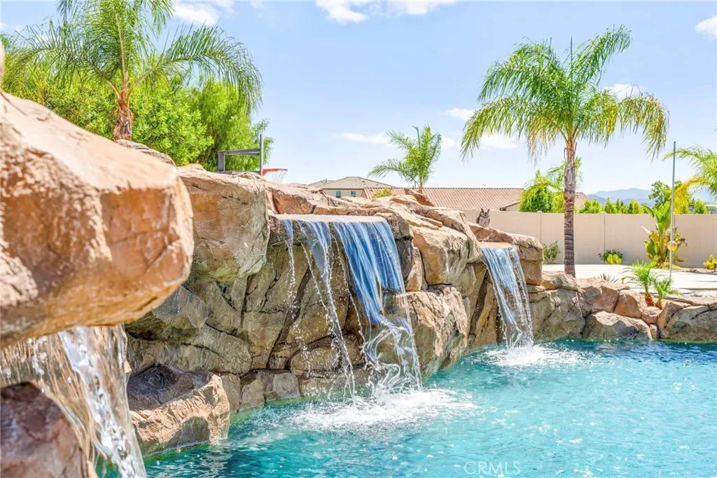 Step outside to your private resort—an entertainer’s paradise designed for year-round enjoyment. The PebbleTec® saltwater pool and spa shimmer under the California sun, accented by three cascading waterfalls and a built-in slide. A freestanding pavilion anchors the backyard with a designer outdoor kitchen and bar, complete with a pizza oven, built-in BBQ, sink, refrigerator, multiple TVs, ceiling fans, and surround sound. Whether hosting lively gatherings or relaxing poolside, this space delivers the ultimate in outdoor living.