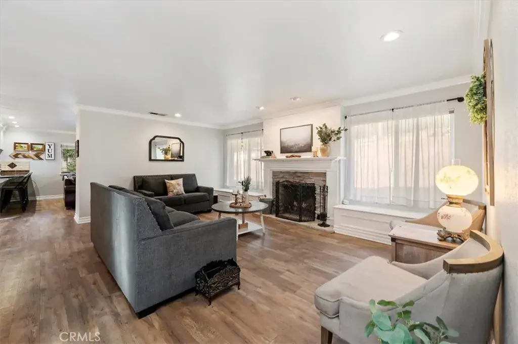 The open and airy floor plan is filled with natural light and thoughtful upgrades, including noise-reducing windows, crown molding, recessed lighting, and updated flooring throughout. The kitchen anchors the home with granite countertops, white shaker cabinetry, stainless steel appliances, and a generous extended countertop seating for six—ideal for both everyday living and effortless entertaining.