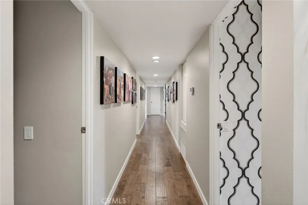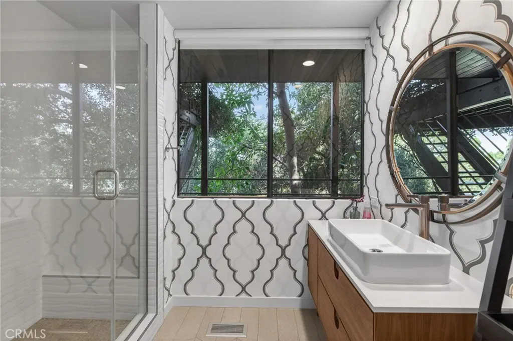 On the lower level, you’ll find all the bedrooms, including a luxurious primary suite complete with a spa-like bathroom and a massive walk-in closet with custom built-ins. Additional features include a sunken, climate-controlled wine cellar, a large indoor laundry room, and a secondary home office space.