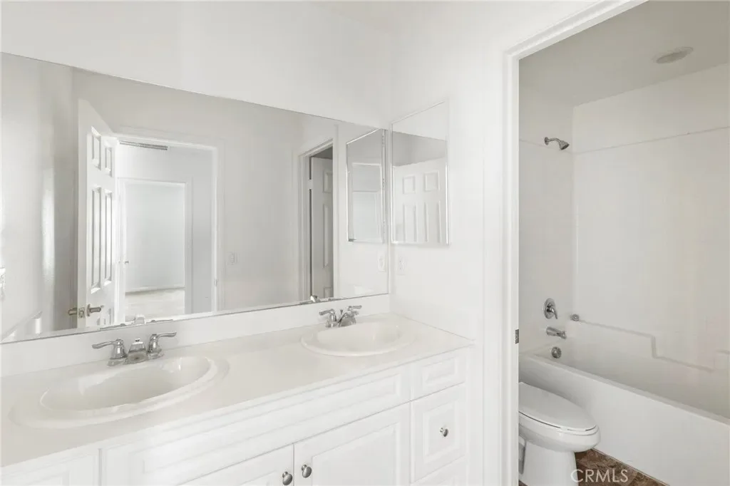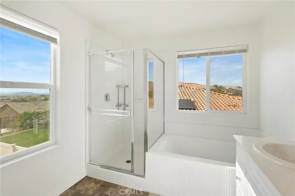 Upstairs, a converted DEN now functions as a fourth bedroom, perfect for larger households or flexible use. Directly across, the expansive primary suite offers peaceful mountain views and a luxurious ensuite bathroom complete with a walk-in shower, soaking tub, dual vanities, and a generous walk-in closet. Two additional well-sized bedrooms, a full bathroom with dual sinks, and an upstairs laundry room complete the second floor. The home has been freshly painted throughout in a bright, modern white, creating a clean and contemporary feel.