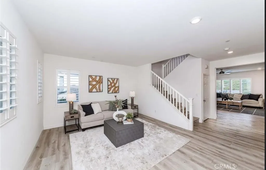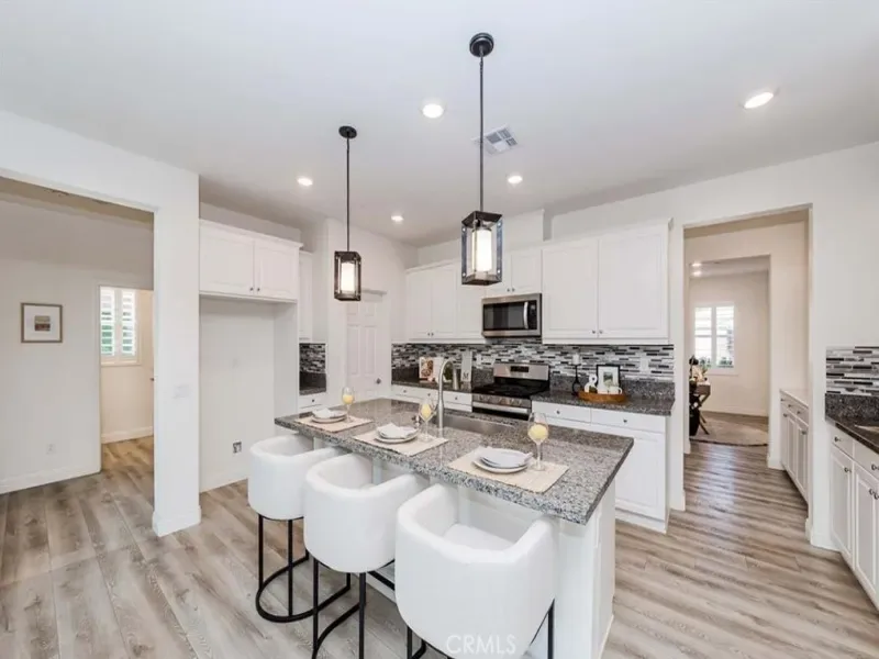 Experience luxury living with mountain views in this stunning home on a spacious 13,000 sq ft lot in the Spring Mountain Ranch Community, Riverside. This elegant residence boasts 5 bedrooms, 3 full bathrooms, a flex room, a large loft, a den, 2 car garages, and RV parking. The entire house features premium vinyl plank flooring, energy-saving solar panels, plantation shutters, ceiling fans, recessed ceiling lights, and a Wi-Fi smart thermostat. The kitchen is a chef’s dream with white thermofoil cabinetry, satin nickel knobs, granite countertops, a premium tiled backsplash, a large island with bar seating, and Whirlpool® stainless steel appliances. A spacious walk-in pantry offers ample storage. The bright living room provides views, while the versatile flex room can serve as a formal dining area or office. The airy and bright expansive great room is perfect for family gatherings. A bedroom and full bathroom on the main floor offer convenience for guests. The primary suite features a bright and spacious bedroom, a huge walk-in closet, a bathroom with a separate tub and walk-in shower, and double vanity sinks with cultured marble countertop. The large loft with picturesque views offers additional space for your family’s needs. Three additional well-sized bedrooms and a full bathroom are located on the second level, along with a large laundry room with plenty of storage cabinets and shelves. The beautifully hardscaped and landscaped backyard is perfect for outdoor enjoyment and has the potential for an ADU. With no HOA fees and proximity to UCR, CBU, Historical Downtown Riverside, and Loma Linda University and Hospital, this home is a must-see!