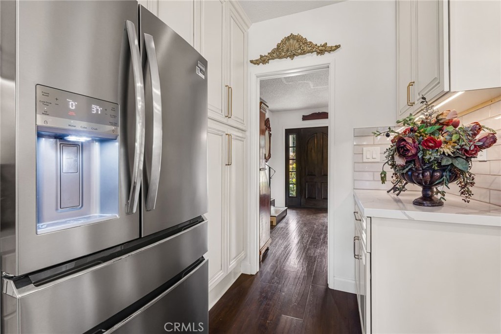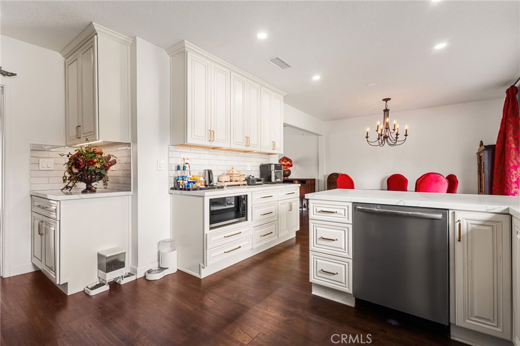 The fully remodeled kitchen is a true centerpiece, featuring sleek quartz countertops, soft-close cabinetry and drawers, and stunning gold-tone hardware that adds a touch of modern elegance—perfect for both everyday living and entertaining.