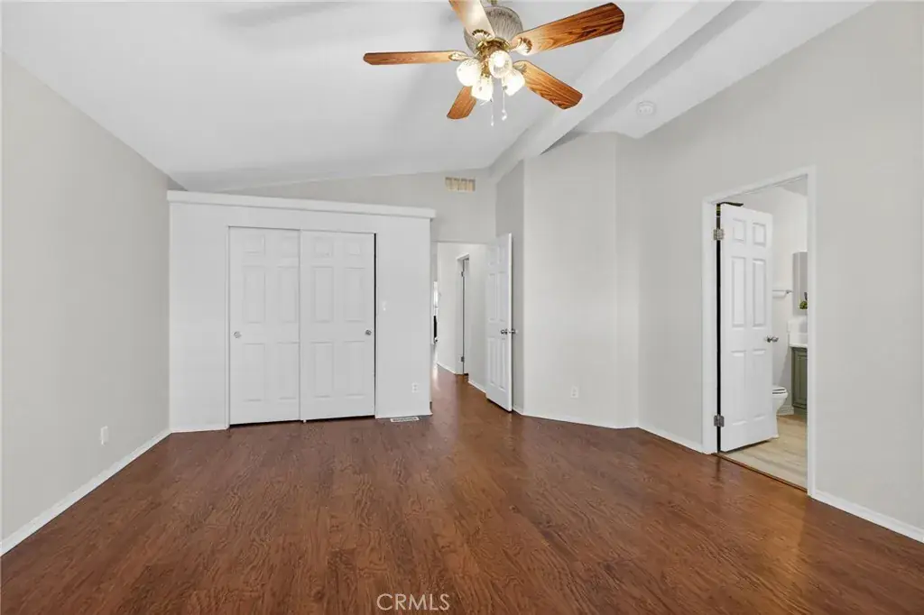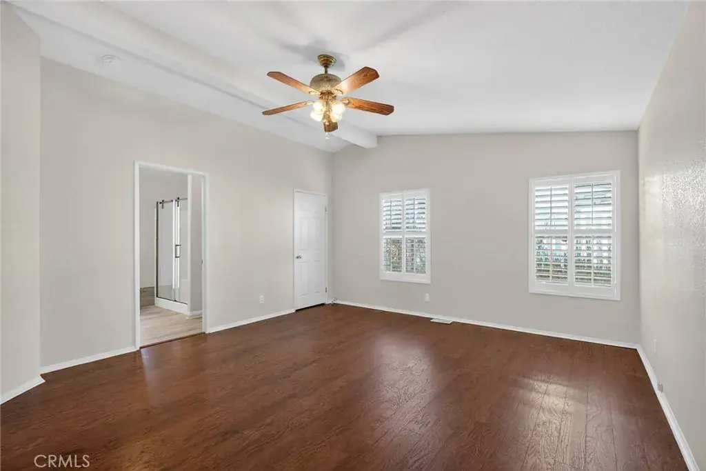 The primary suite provides a peaceful retreat with vaulted ceilings and two closets. The en-suite bath includes a walk-in shower and sleek vanity with elegant dual mirrors. Two additional bedrooms offer plenty of flexibility for guests or hobbies. The second full bath features tasteful finishes and thoughtful updates.