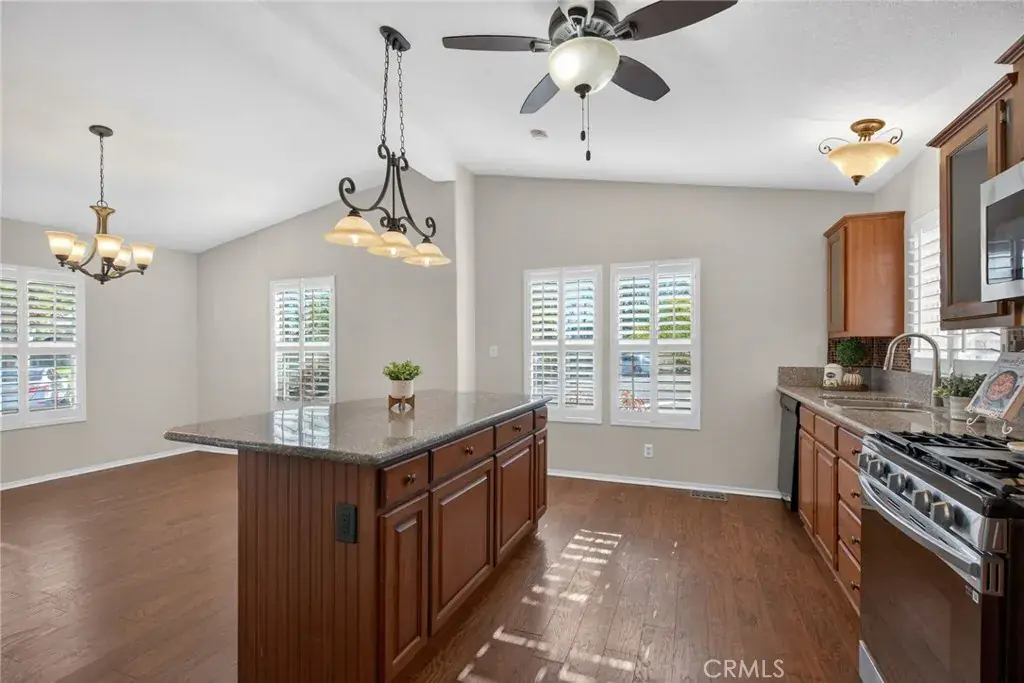 The modern kitchen is a chef’s delight featuring a granite island with bar seating, rich wood cabinetry with glass accents, stainless steel appliances, and ample counter space. The adjacent dining room is framed with bright windows and stylish light fixtures, making meals feel warm and welcoming.