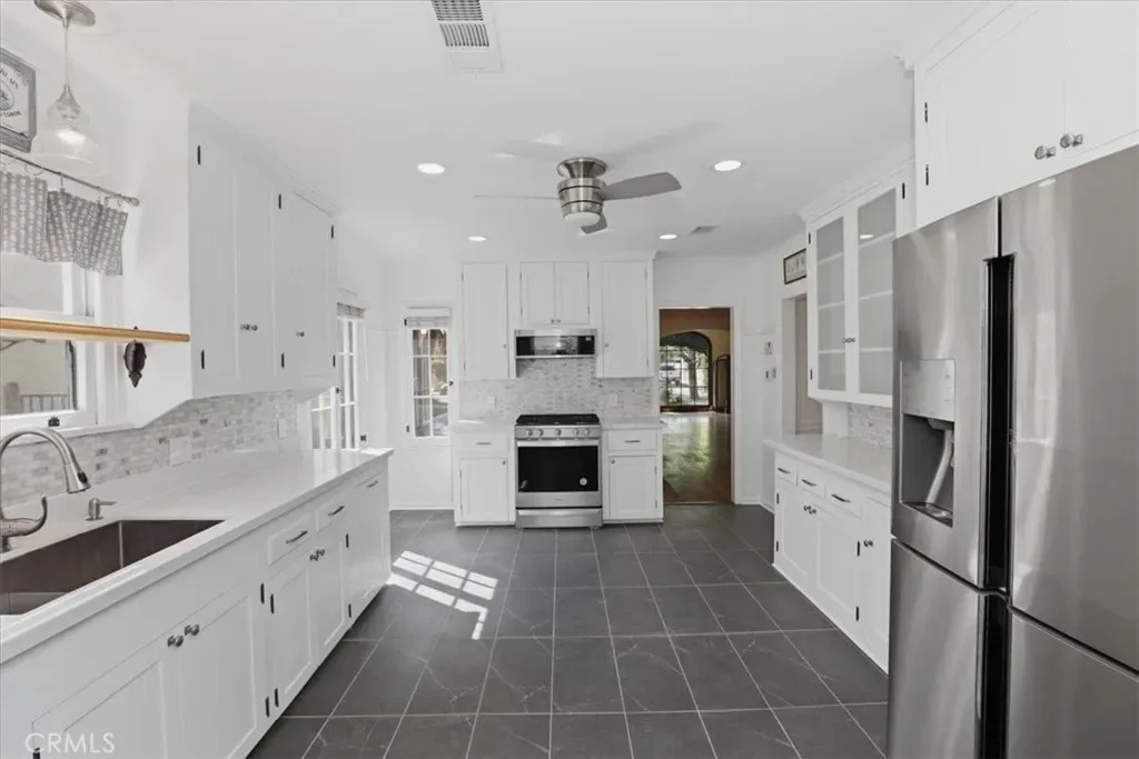 Step outside to your private backyard retreat featuring a refinished, original 1930s-era pool with solar heating, custom stamped concrete, and lush, garden-like landscaping with mature fruit trees.