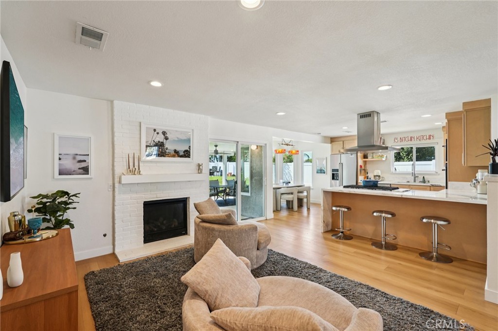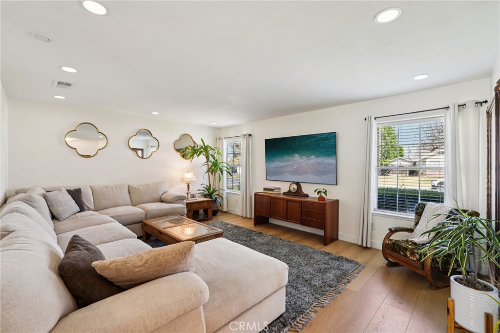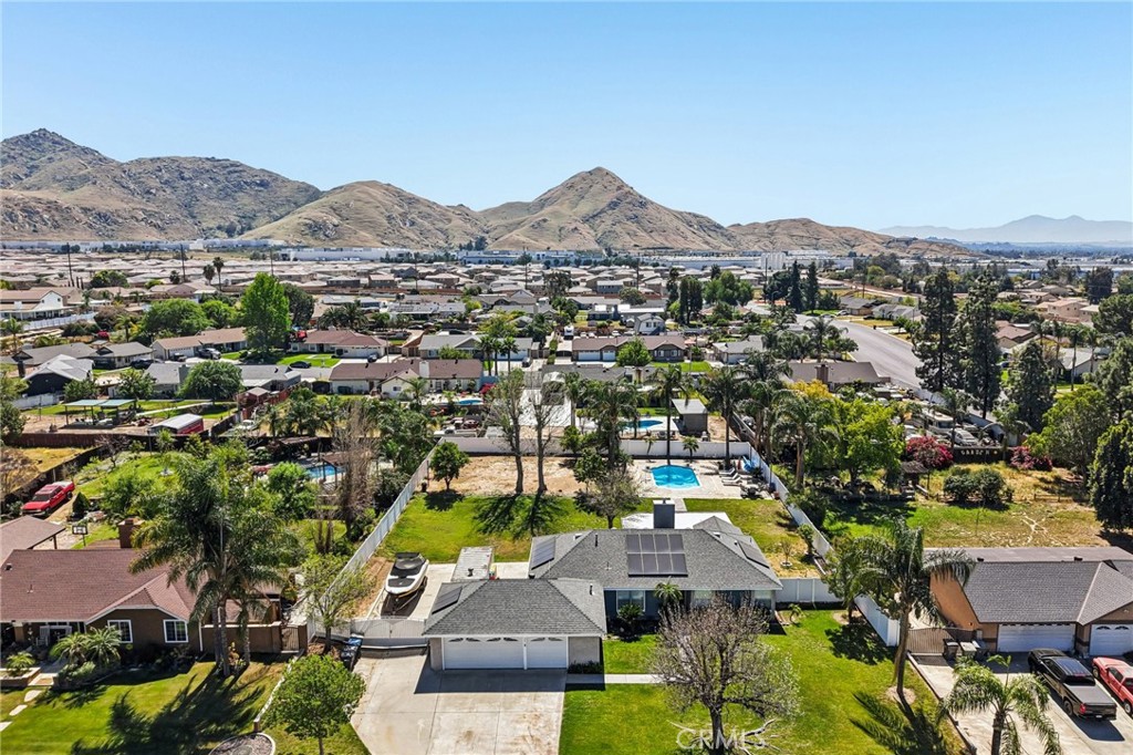 Welcome to 470 Conners Ln in Riverside, California. This beautifully upgraded single-story cul-de-sac pool home offers 3 bedrooms, 2 bathrooms, and a spacious 3-car garage, all situated on nearly half an acre of land. This property features gated RV parking and fully paid-off solar, providing both convenience and energy efficiency. Step through the inviting double door entry into a bright and open great room that seamlessly combines the living room, dining area, and upgraded kitchen. The kitchen is designed for both function and style, featuring new cabinets, stunning marble countertops with a waterfall edge, a breakfast bar, new appliances, and a sleek stainless steel hood vent over the stovetop. Bay windows offer picturesque views of the backyard and pool, while new waterproof wood laminate flooring and LED lighting enhance the modern feel throughout the main living spaces. A cozy fireplace in the dining area, currently styled as a sitting room, adds warmth and versatility. Down the hall, the guest bathroom has been tastefully remodeled with a quartz countertop sink and updated shower, along with convenient access to the backyard. The primary suite is a true retreat, filled with natural light and featuring dual closets and a beautifully upgraded bathroom complete with a walk-in shower, new fixtures, and a quartz countertop vanity. Step outside to your private backyard oasis, where an expansive layout offers the perfect setting for relaxation and entertaining. Enjoy year around outdoor living under the large covered Alumawood patio equipped with ceiling fans and hookups for a refrigerator and TV. The sparkling pool, paired with a generous grassy area, multiple fruit trees and white vinyl fencing create a resort-style atmosphere with ample space for gatherings and leisure.