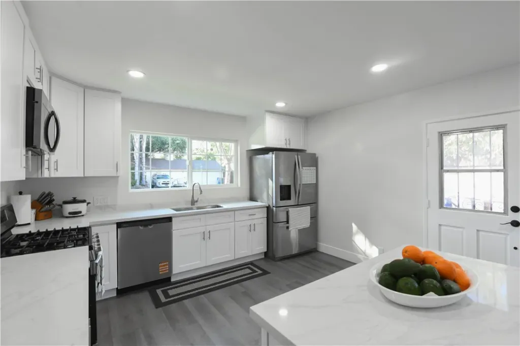 RV Parking! Enjoy brand-new interior paint and a beautifully remodeled kitchen featuring new flooring, shaker-style cabinets, updated counters, inset and overhead lighting, plus a center island and stainless-steel appliances, including gas range/oven, dishwasher, and microwave. A cozy living room offers a welcoming fireplace and an energy-efficient ceiling fan, with an adjacent dining area for easy entertaining. Both bathrooms have been tastefully upgraded with tile flooring, new enclosures, updated fixtures, and modern vanities. The primary bedroom includes wood floors, double closets, a ceiling fan, and a stylish barn door leading to the ensuite bath. Additional bedrooms are generously sized and share the refreshed full hall bath. Central heat and air conditioning and newer windows. French doors open to a covered patio and a spacious, block-walled backyard complete with fruit trees; citrus and avocado plus a horseshoe pit for outdoor fun. 2 Car garage plus the extra-wide concrete driveway and gated RV parking provide excellent convenience and flexibility.