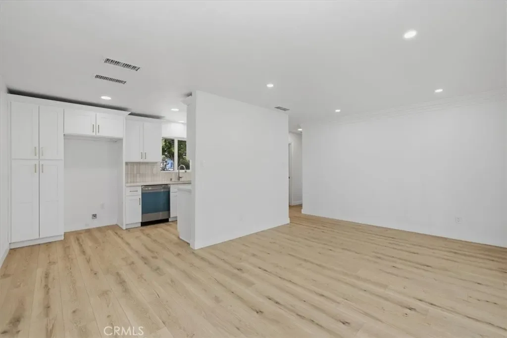 The open-concept kitchen is a standout, boasting stainless steel appliances (including a dishwasher and gas range), a deep undermount sink, recessed lighting, and ample cabinet space—perfect for everyday meals or entertaining. Adjacent living and dining areas flow seamlessly, with natural light pouring in through the windows.