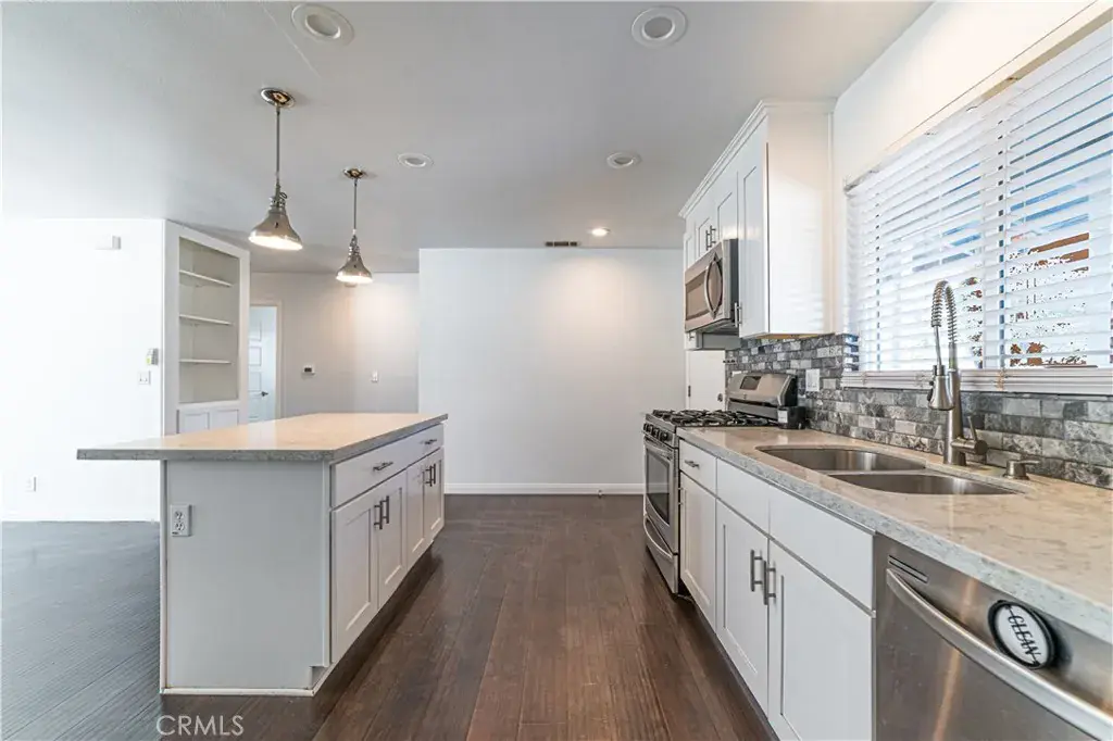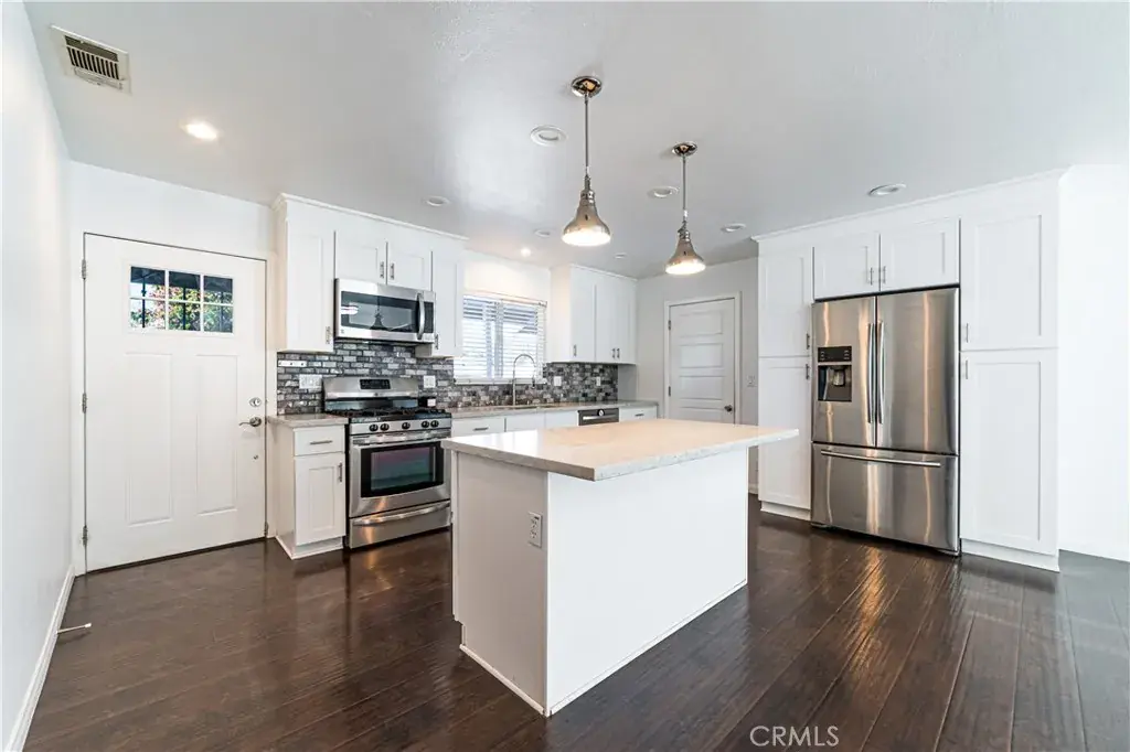 Inside, you’ll find fresh new paint throughout, upgraded dual-pane windows, shaker-style cabinets, quartz countertops, a beautifully tiled kitchen backsplash, and stainless steel appliances.
