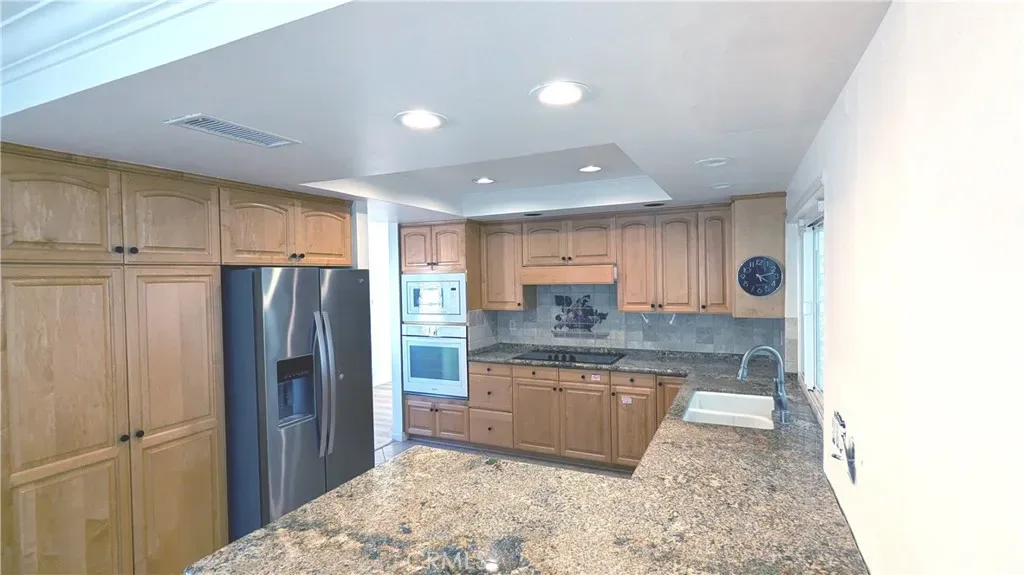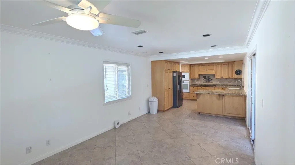 Welcome to this spacious and unique single-level home (no sunken floors or steps) in the highly desirable Canyon Crest community, a close neighbor of Country Club Golf Course. Step through the elegant double-door entry into a massive great room with vaulted ceilings, cozy fireplace, and dual sliding glass doors filled with abundant natural light. Enjoy tile and luxury vinyl flooring throughout— stylish and easy to maintain. The chef’s kitchen features a custom vent hood, cooktop, built-in microwave & wall oven, granite countertops, and rich wood cabinetry. Pull out shelves and turn tables enhance your kitchen storage needs. A breakfast nook and expanded adjacent bonus room offer flexible space for work, play, or relaxation. The primary suite includes heightened ceilings, double sink vanities, a generous walk-in closet, and sliding door access to lovely hillside views. Two additional bedrooms—one with its own walk-in closet and another with a Murphy bed setup—provide versatile living options. A spacious hallway bathroom, linen cabinets, and a laundry room with sink add convenience. Ceiling fans in all bedrooms and family room help keep you comfortable. Whole house recirculating hot water pump provides you instant hot water without the wait. The oversized two-car garage offers extra space for a workshop and/or golf cart. Outside, enjoy a well-kept lawn, custom brickwork, and fully covered wood patio with skylights that provide shade and soft natural light. Additional skylights and solar tubes throughout the home enhance brightness and energy efficiency, complemented by newer double-pane windows and sliders. Located near the Town Center’s shops and restaurants, with easy access to UC Riverside and nearby freeways. The community pool and spa add to resort-like lifestyle amenities. This reconfigured home is like no other in the neighborhood, don’t miss this rare opportunity—schedule your showing today!