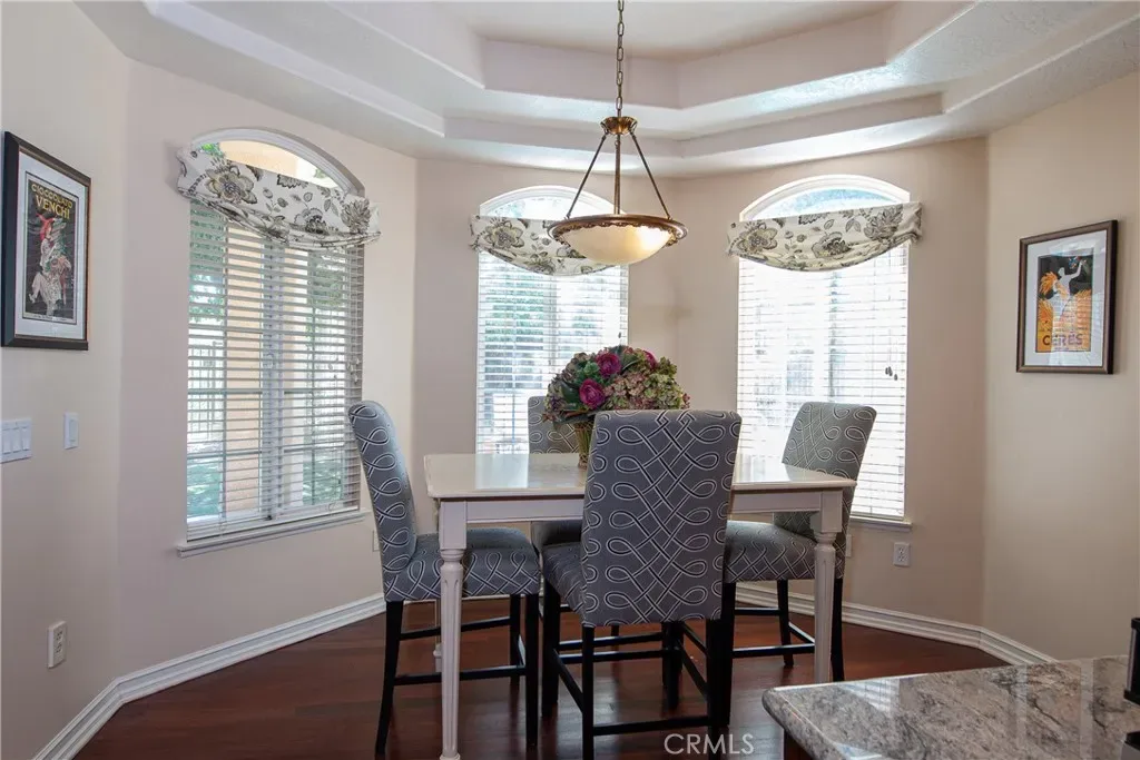 The traditional step-down living room and formal dining room with buffet niche/dry bar create an inviting setting for gatherings. The chef’s kitchen boasts a center island, breakfast nook, and seamless flow into the expansive family room.