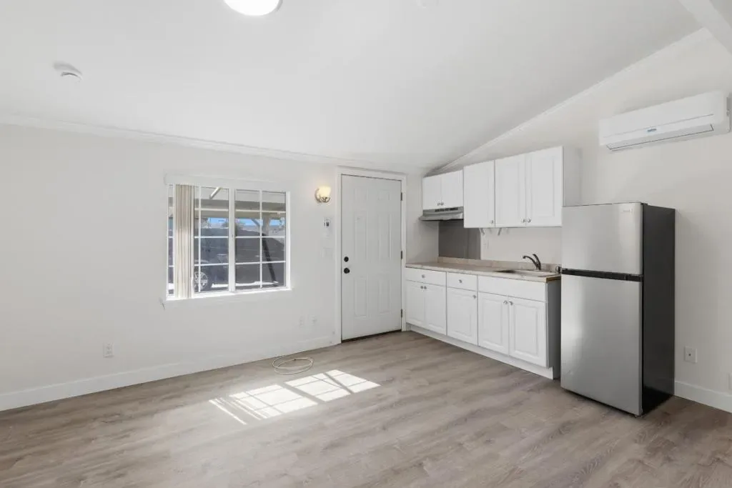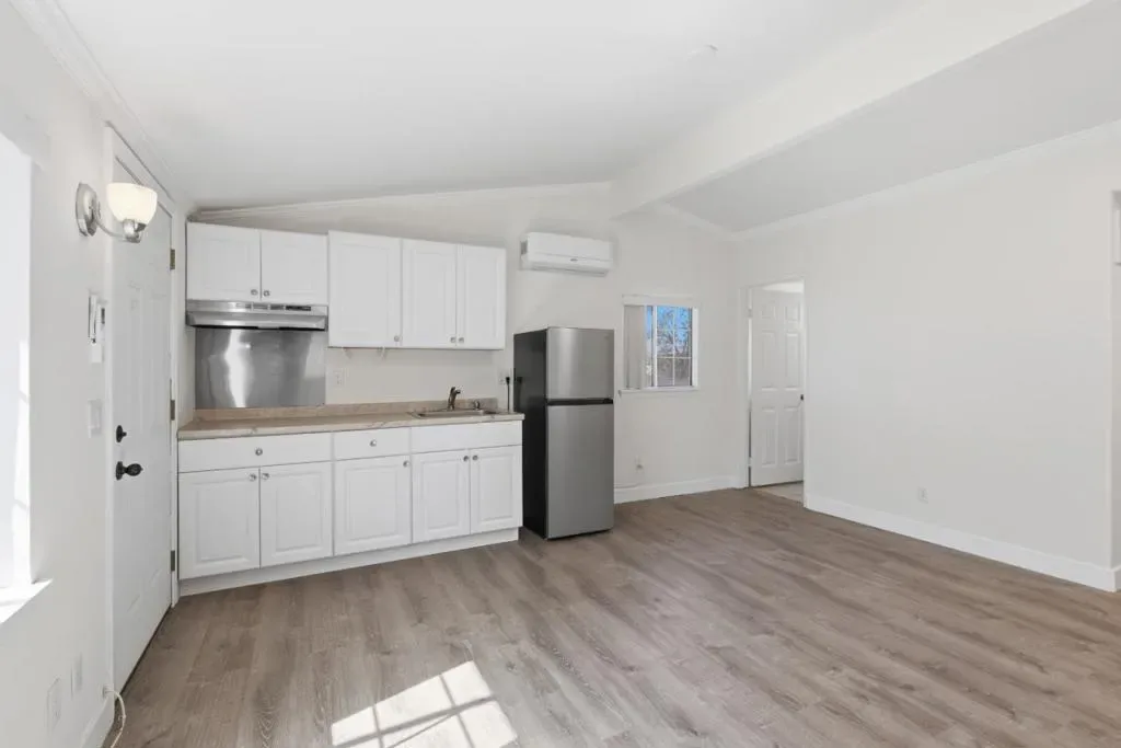 Comfortable living and practical design come together in this inviting studio-style unit with 1 bathroom, offering a bright and functional space that feels easy to settle into. Wide-plank flooring stretches across the main living area. An open layout allows the living and sleeping areas to share one flexible space, while a recessed nook and an open closet with shelving provide helpful storage options. Your kitchen is neatly arranged along one wall with white cabinetry, generous counter space, and a stainless steel refrigerator. A stainless sink and overhead cabinetry keep essentials within reach Meanwhile, the bathroom includes a tiled tub and shower combination, a single-sink vanity, and additional natural light from a frosted window. Positioned in Riversides La Sierra area, this location places everyday conveniences close by. Shopping and dining options at Galleria at Tyler are just a short drive away, featuring numerous retail stores, restaurants, and a movie theater. Riverside Plaza also offers Trader Joes, Nordstrom Rack, and additional dining options. Commuting is convenient with the nearby RiversideLa Sierra station, while local universities and neighborhood shops add to the convenience of the surrounding area.