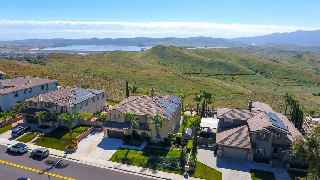 Perched on a premium half-acre lot in the highly desirable Lake Hills community, Lake Mathews view estate offers approximately 4,576 square feet of refined living. The residence showcases expansive interiors highlighted by soaring ceilings, abundant natural light, and multiple fireplaces that create warmth and architectural drama. The spacious chef’s kitchen with granite countertops and rich cabinetry flows seamlessly into generous living and family rooms designed for entertaining. A luxurious primary suite features a private retreat area and balcony perfectly positioned to capture sweeping panoramic views of rolling hills and the lake. Two walk in closets, spa tub, large shower, makeup table and separate sinks. Additional highlights include travertine flooring, loft with Billiard table, central vacuum system, and a 3-car tandem garage with storage shelves, EV charger with a Tesla Battery, 38 (owned) solar panels means no electrical bills, zoned A/C units (installed a year ago), home intercom communication system, smart home features include temperature control, cameras and security. 4 TV’s included with surround sound system with amplifier. Outdoors, extensive hardscaping and elevated vantage points create an ideal setting to enjoy spectacular sunsets and tranquil hillside surroundings. Multiple fruit trees include: lemon, apple, 2 fig, kumquat, pomegranate, mulberry sweet lemon, loquat, nectarine, persimmon, & avocado. This is an exceptional opportunity to own a view property in one of Riverside’s most sought-after neighborhoods.