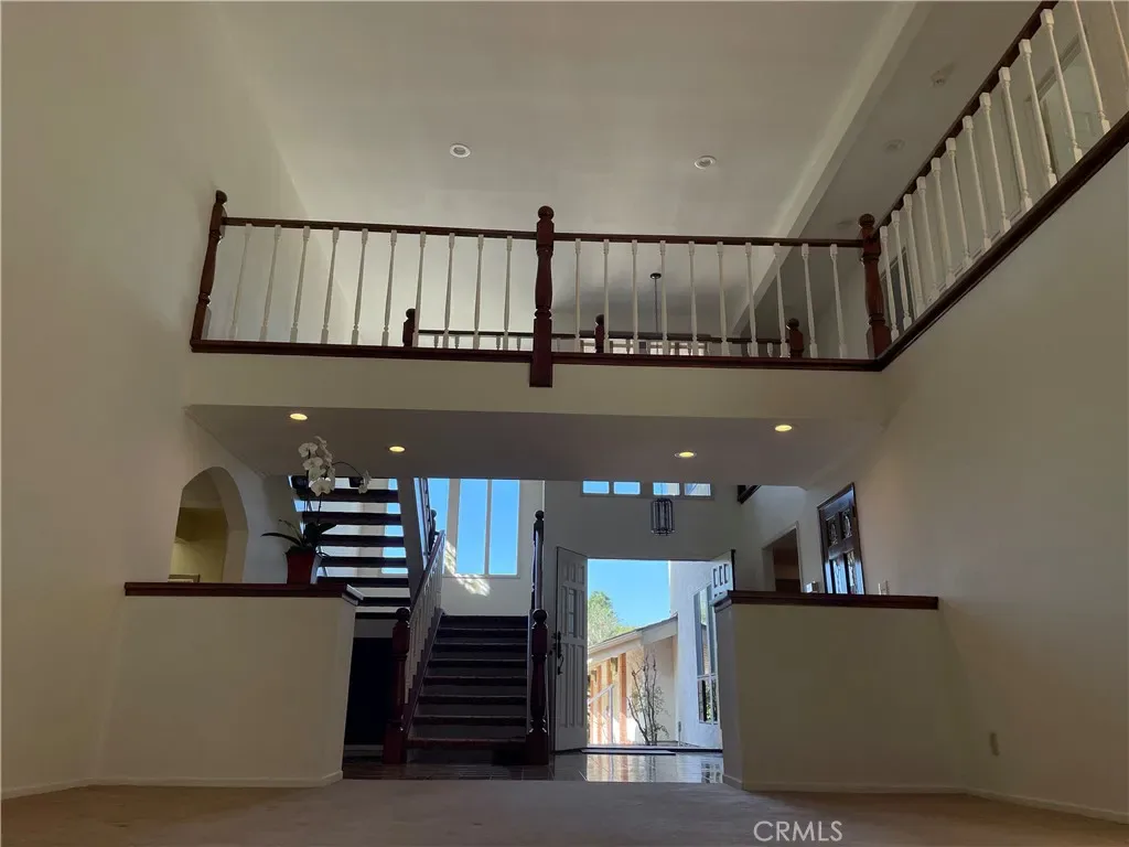 A striking staircase near the entry is flanked by large windows, creating a bright and inviting ascent to the upper level. Upstairs, you’ll find three additional bedrooms and a full bathroom, all overlooking the expansive backyard. The outdoor space features a flat grassy area that transitions into a lush, gently sloping hillside, offering privacy and scenic views. An upstairs balcony provides a peaceful vantage point to enjoy the surrounding landscape.