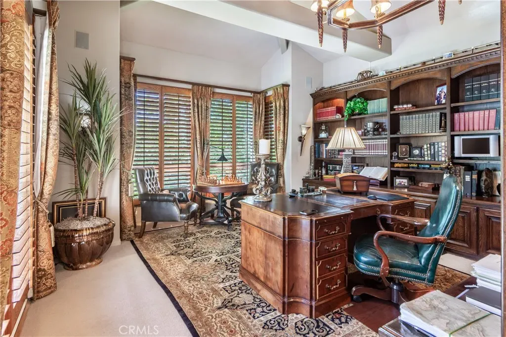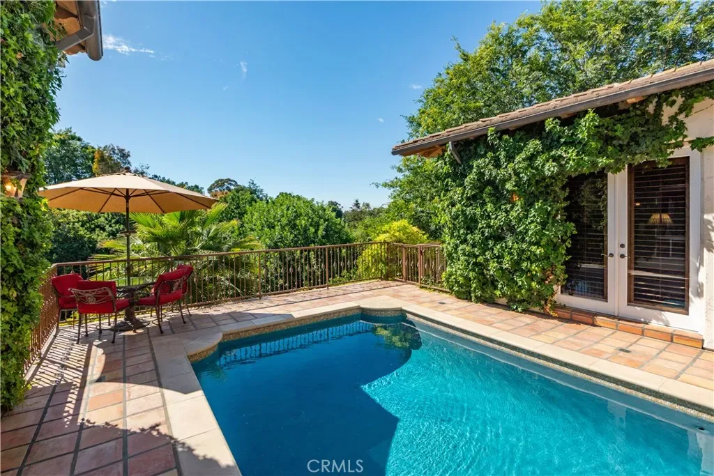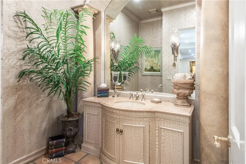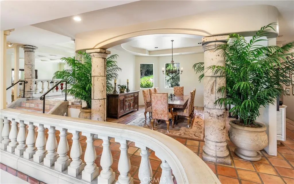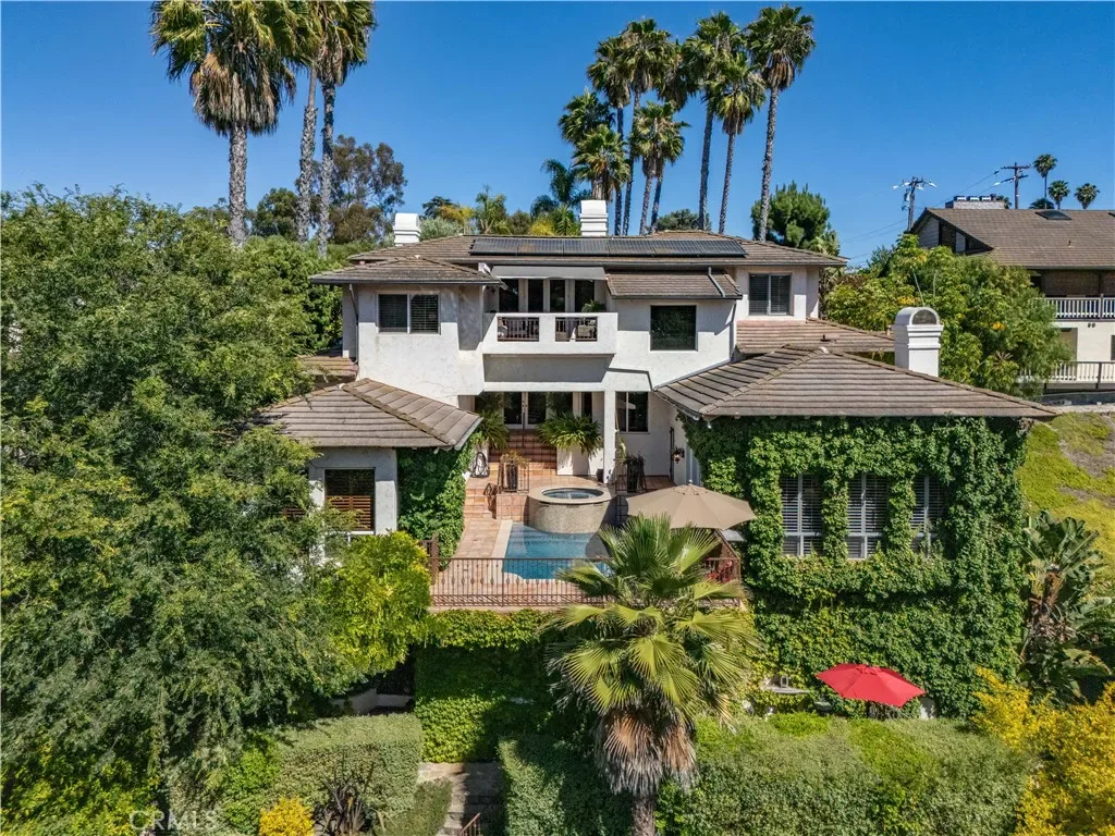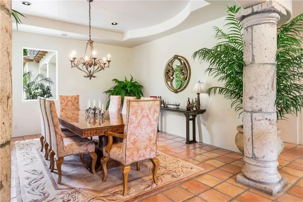 This gated custom estate blends European charm with refined California living. Elegant tile floors, stone accents, and architectural detail set the tone throughout. The living room features soaring ceilings and a stately fireplace, while the large formal dining room is ideal for entertaining. The kitchen blends warmth and functionality with custom cabinetry, granite countertops, and a professional-grade stainless steel range. The nearby family room features a fireplace, wet bar, and French doors that open to a charming courtyard patio with pool, spa, and a hidden sauna tucked into the corner. The secluded primary suite is a true retreat with its own fireplace, spa-like bath with jetted tub, sitting room with wet bar, walk-in closet, and a private veranda with hillside views. Additional features include an incredible temperature-controlled wine cellar, a detached guest house with kitchenette and loft, bocce court, putting green, and a 3-car garage with direct access. Solar panels with Tesla backup batteries add efficiency, while a long private driveway enhances the sense of privacy. A compelling blend of space, amenities, and seclusion in one of Rolling Hills Estates’ most desirable settings.