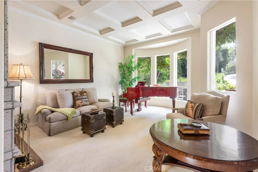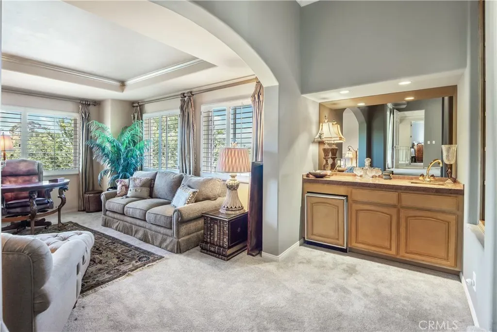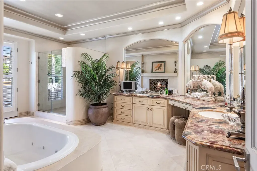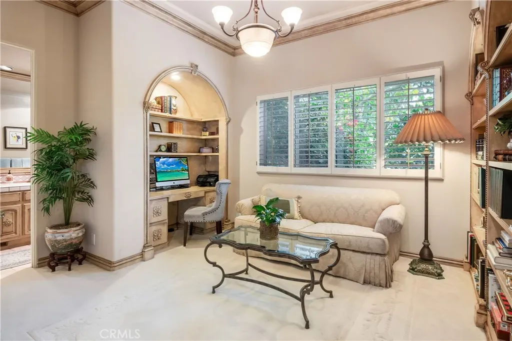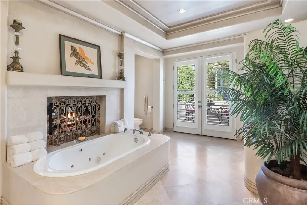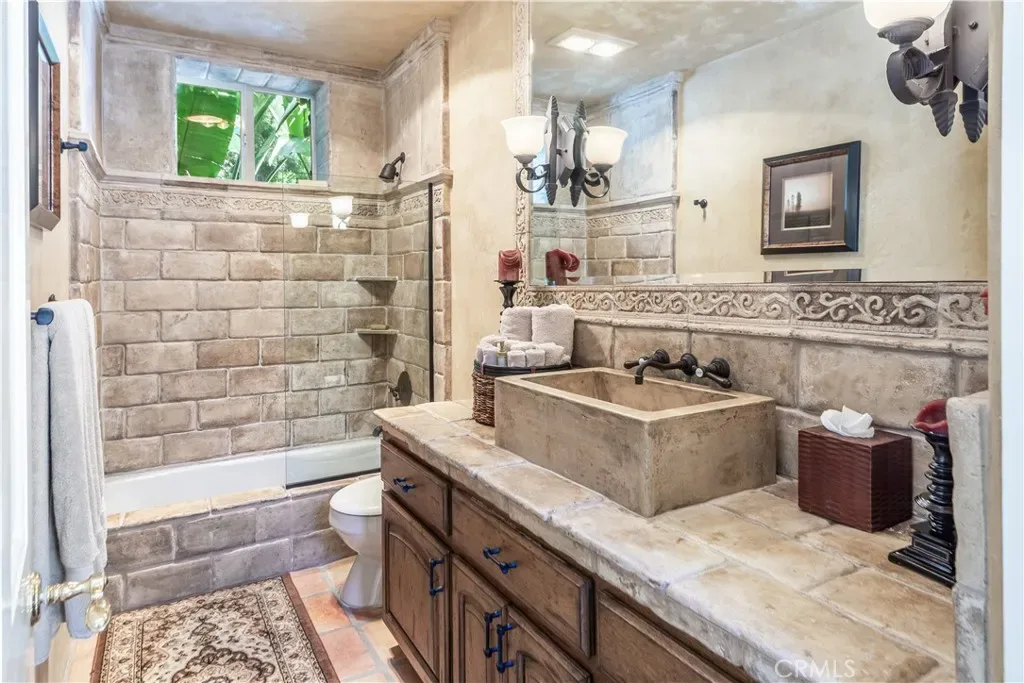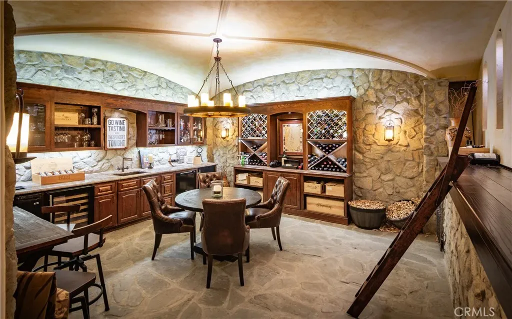 This gated custom estate blends European charm with refined California living. Elegant tile floors, stone accents, and architectural detail set the tone throughout. The living room features soaring ceilings and a stately fireplace, while the large formal dining room is ideal for entertaining. The kitchen blends warmth and functionality with custom cabinetry, granite countertops, and a professional-grade stainless steel range. The nearby family room features a fireplace, wet bar, and French doors that open to a charming courtyard patio with pool, spa, and a hidden sauna tucked into the corner. The secluded primary suite is a true retreat with its own fireplace, spa-like bath with jetted tub, sitting room with wet bar, walk-in closet, and a private veranda with hillside views. Additional features include an incredible temperature-controlled wine cellar, a detached guest house with kitchenette and loft, bocce court, putting green, and a 3-car garage with direct access. Solar panels with Tesla backup batteries add efficiency, while a long private driveway enhances the sense of privacy. A compelling blend of space, amenities, and seclusion in one of Rolling Hills Estates’ most desirable settings.
