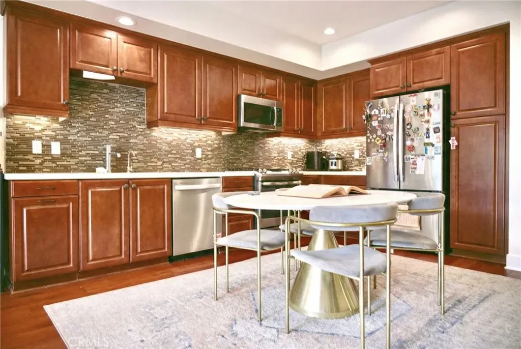 The open-concept interior features elegant wood flooring and a kitchen outfitted with premium countertops, a mosaic backsplash, and a high-end stainless steel appliance package. The spacious primary retreat offers a large walk-in closet and a spa-like ensuite with European cabinetry and honed tile. Modern essentials include central HVAC with a smart thermostat, dual-glazed windows, and an in-home laundry suite.